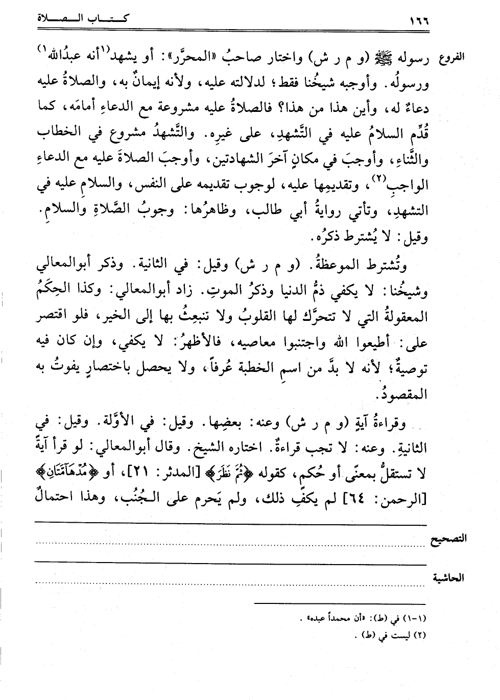 رَسُولِهِ صَلَّى اللَّهُ عَلَيْهِ وَسَلَّمَ "وم ر ش" واختار صاحب المحرر: أو يشهد 1"أنه عبد الله"1 وَرَسُولُهُ. وَأَوْجَبَهُ شَيْخُنَا فَقَطْ، لِدَلَالَتِهِ عَلَيْهِ؛ وَلِأَنَّهُ إيمَانٌ بِهِ، وَالصَّلَاةُ عَلَيْهِ دُعَاءٌ لَهُ، وَأَيْنَ هَذَا مِنْ هَذَا، فَالصَّلَاةُ عَلَيْهِ مَشْرُوعَةٌ مَعَ الدُّعَاءِ أَمَامَهُ، كَمَا قُدِّمَ السَّلَامُ عَلَيْهِ فِي التَّشَهُّدِ عَلَى غَيْرِهِ، وَالتَّشَهُّدُ مَشْرُوعٌ فِي الْخِطَابِ وَالثَّنَاءِ، وَأَوْجَبَ فِي مَكَان آخَرَ الشَّهَادَتَيْنِ، وَأَوْجَبَ الصلاة عليه مع الدعاء الواجب2، وَتَقْدِيمُهَا عَلَيْهِ لِوُجُوبِ تَقْدِيمِهِ عَلَى النَّفْسِ، وَالسَّلَامُ عَلَيْهِ فِي التَّشَهُّدِ، وَتَأْتِي رِوَايَةُ أَبِي طَالِبٍ، وَظَاهِرُهَا وُجُوبُ الصَّلَاةِ وَالسَّلَامِ، وَقِيلَ: لَا يُشْتَرَطُ ذِكْرُهُ.