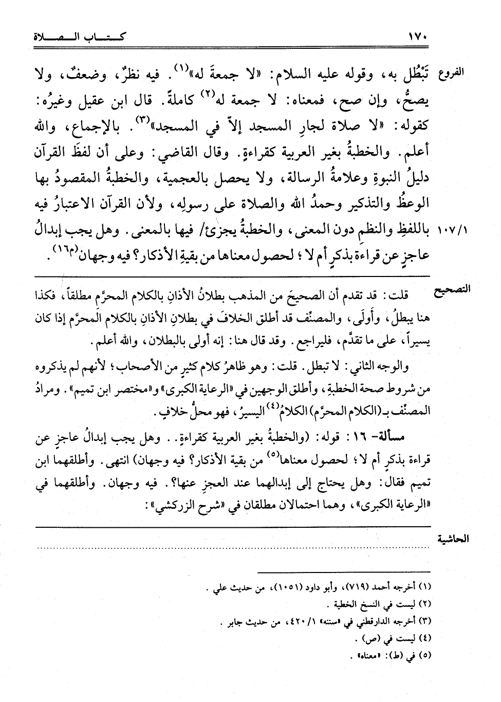 تَبْطُلْ بِهِ، وَقَوْلُهُ عَلَيْهِ السَّلَامُ: "لَا جُمُعَةَ لَهُ"1 فِيهِ نَظَرٌ، وَضَعْفٌ، وَلَا يَصِحُّ، وَإِنْ صَحَّ، فَمَعْنَاهُ: لَا جُمُعَةَ لَهُ2 كَامِلَةٌ. قَالَ ابْنُ عَقِيلٍ وَغَيْرُهُ كَقَوْلِهِ: "لَا صَلَاةَ لِجَارِ الْمَسْجِدِ إلَّا فِي الْمَسْجِدِ"3 بِالْإِجْمَاعِ، وَاَللَّهُ أَعْلَمُ. وَالْخُطْبَةُ بِغَيْرِ عَرَبِيَّةٍ كَقِرَاءَةٍ، وَقَالَ الْقَاضِي: وَعَلَى أَنَّ لَفْظَ الْقُرْآنِ دَلِيلُ النُّبُوَّةِ وَعَلَامَةُ الرِّسَالَةِ وَلَا يَحْصُلُ بِالْعَجَمِيَّةِ، وَالْخُطْبَةُ الْمَقْصُودُ بِهَا الْوَعْظُ وَالتَّذْكِيرُ وَحَمْدُ اللَّهِ وَالصَّلَاةُ عَلَى رَسُولِهِ؛ وَلِأَنَّ الْقُرْآنَ الِاعْتِبَارُ فِيهِ بِاللَّفْظِ وَالنَّظْمِ دُونَ الْمَعْنَى، وَالْخُطْبَةُ يُجْزِئُ فِيهَا الْمَعْنَى، وَهَلْ يَجِبُ إبْدَالُ عَاجِزٍ عَنْ قِرَاءَةٍ بِذِكْرٍ أَمْ لَا لِحُصُولِ مَعْنَاهَا مِنْ بَقِيَّةِ الْأَذْكَارِ؟ فِيهِ وَجْهَانِ "م 16".