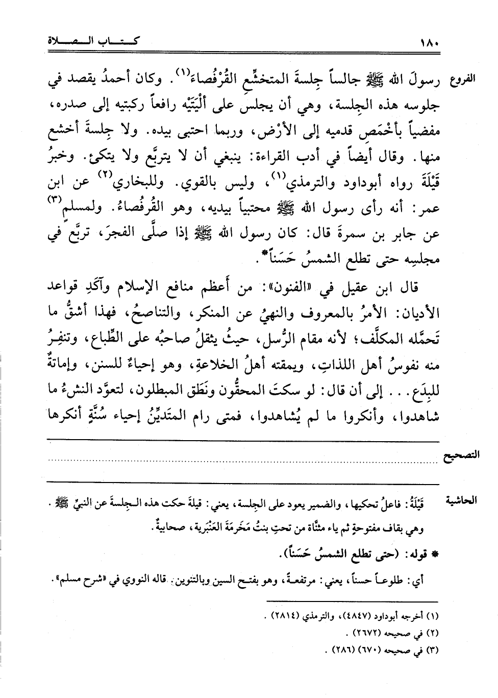 رَسُولَ اللَّهِ صَلَّى اللَّهُ عَلَيْهِ وَسَلَّمَ جَالِسًا جِلْسَةَ الْمُتَخَشِّعِ الْقُرْفُصَاءَ1، وَكَانَ أَحْمَدُ يَقْصِدُ فِي جُلُوسِهِ هَذِهِ الْجِلْسَةَ وَهِيَ أَنْ يَجْلِسَ عَلَى أَلْيَتَيْهِ رَافِعًا رُكْبَتَيْهِ إلَى صَدْرِهِ، مُفْضِيًا بِأَخْمَصِ قَدَمَيْهِ إلَى الْأَرْضِ، وَرُبَّمَا احْتَبَى بِيَدَيْهِ، وَلَا جِلْسَةَ أَخْشَعُ مِنْهَا، وَقَالَ أَيْضًا فِي آدَابِ الْقِرَاءَةِ: يَنْبَغِي أَنْ لَا يَتَرَبَّعَ وَلَا يَتَّكِئَ. وَخَبَرُ قِيلَةَ رَوَاهُ أَبُو دَاوُد وَالتِّرْمِذِيُّ1، وَلَيْسَ بِالْقَوِيِّ، وَلِلْبُخَارِيِّ2 عَنْ ابْنِ عُمَرَ: أَنَّهُ رَأَى رَسُولَ اللَّهِ صَلَّى اللَّهُ عَلَيْهِ وَسَلَّمَ مُحْتَبِيًا بِيَدَيْهِ، وَهُوَ الْقُرْفُصَاءُ، وَلِمُسْلِمٍ3 عَنْ جَابِرِ بْنِ سَمُرَةَ قَالَ: كَانَ رَسُولُ اللَّهِ صَلَّى اللَّهُ عَلَيْهِ وَسَلَّمَ إذَا صَلَّى الْفَجْرَ تَرَبَّعَ فِي مَجْلِسِهِ حَتَّى تَطْلُعَ الشَّمْسُ حَسَنًا.