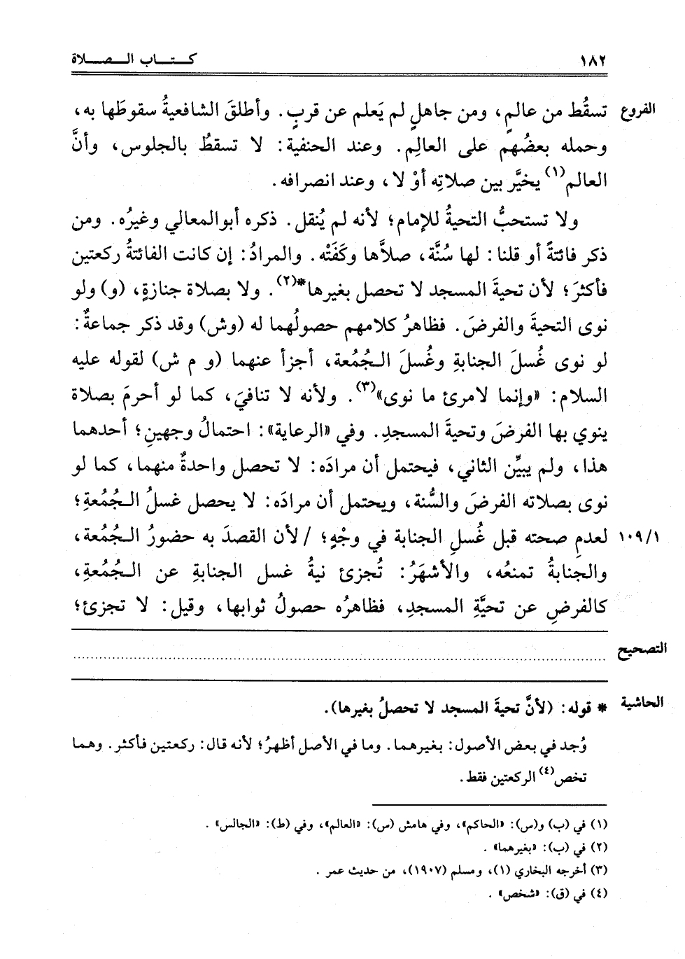 وَلَا تُسْتَحَبُّ التَّحِيَّةُ لِلْإِمَامِ؛ لِأَنَّهُ لَمْ يُنْقَلْ. ذَكَرَهُ أَبُو الْمَعَالِي وَغَيْرُهُ، وَمَنْ ذَكَرَ فَائِتَةً أَوْ قُلْنَا لَهَا سُنَّةً صَلَّاهَا وَكَفَتْ، وَالْمُرَادُ إنْ كَانَتْ الْفَائِتَةُ رَكْعَتَيْنِ فَأَكْثَرَ؛ لِأَنَّ تَحِيَّةَ الْمَسْجِدِ لَا تَحْصُلُ بِغَيْرِهَا2 "و" وَلَا بِصَلَاةِ جِنَازَةٍ "و" وَلَوْ نَوَى التَّحِيَّةَ وَالْفَرْضَ، فَظَاهِرُ "كَلَامِهِمْ" حُصُولُهُمَا "وش" وَقَدْ ذَكَرَ جَمَاعَةٌ: لَوْ نَوَى غُسْلَ الْجَنَابَةِ وَغُسْلَ الْجُمُعَةِ أَجْزَأَ عَنْهُمَا "وم ش" لِقَوْلِهِ عَلَيْهِ السَّلَامُ: "وَإِنَّمَا لِامْرِئٍ مَا نَوَى" 3. وَلِأَنَّهُ لَا تَنَافِي، كَمَا لَوْ أَحْرَمَ بصلاة ينوي بِهَا الْفَرْضَ وَتَحِيَّةَ الْمَسْجِدِ، وَفِي الرِّعَايَةِ احْتِمَالُ وَجْهَيْنِ، أَحَدُهُمَا هَذَا، وَلَمْ يُبَيِّنْ الثَّانِي، فَيَحْتَمِلُ أَنْ مُرَادَهُ لَا تَحْصُلُ وَاحِدَةٌ مِنْهُمَا، كَمَا لَوْ نَوَى بِصَلَاتِهِ الْفَرْضَ وَالسُّنَّةَ، وَيَحْتَمِلُ أَنَّ مُرَادَهُ لَا يَحْصُلُ غُسْلُ الْجُمُعَةِ خَاصَّةً، لِعَدَمِ صِحَّتِهِ قَبْلَ غُسْلِ الْجَنَابَةِ فِي وَجْهٍ. لِأَنَّ الْقَصْدَ بِهِ حُضُورُ الْجُمُعَةِ، وَالْجَنَابَةُ تَمْنَعُهُ، وَالْأَشْهَرُ تُجْزِئُ نِيَّةُ غُسْلِ الْجَنَابَةِ عَنْ الْجُمُعَةِ، كَالْفَرْضِ عَنْ تَحِيَّةِ الْمَسْجِدِ، فَظَاهِرُهُ حُصُولُ ثَوَابِهَا، وَقِيلَ: لا تجزئ،