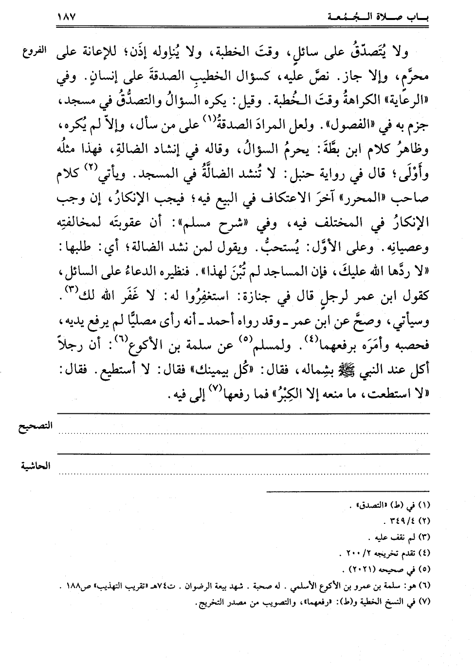 وَلَا يَتَصَدَّقُ. عَلَى سَائِلٍ وَقْتَ الْخُطْبَةِ، وَلَا يُنَاوِلُهُ إذَنْ لِلْإِعَانَةِ عَلَى مُحَرَّمٍ، وَإِلَّا جَازَ، نَصَّ عَلَيْهِ، كَسُؤَالِ الْخَطِيبِ الصَّدَقَةَ عَلَى إنْسَانٍ، وَفِي الرِّعَايَةِ: الْكَرَاهَةُ وَقْتَ الْخُطْبَةِ، وَقِيلَ: يُكْرَهُ السُّؤَالُ وَالتَّصَدُّقُ فِي مَسْجِدٍ، جَزَمَ بِهِ فِي الفصول، ولعل المراد الصدقة1 عَلَى مَنْ سَأَلَ، وَإِلَّا لَمْ يُكْرَهْ، وَظَاهِرُ كَلَامِ ابْنِ بَطَّةَ: يَحْرُمُ السُّؤَالُ، وَقَالَهُ فِي إنْشَادِ الضَّالَّةِ، فَهَذَا مِثْلُهُ وَأَوْلَى، قَالَ فِي رِوَايَةِ حَنْبَلٍ: لَا تُنْشَدُ الضَّالَّةُ فِي الْمَسْجِدِ، وَيَأْتِي2 كَلَامُ صَاحِبِ الْمُحَرَّرِ آخِرَ الِاعْتِكَافِ فِي الْبَيْعِ فِيهِ، فَيَجِبُ الْإِنْكَارُ إنْ وَجَبَ الْإِنْكَارُ فِي الْمُخْتَلَفِ فِيهِ، وَفِي شَرْحِ مُسْلِمٍ أَنَّ عُقُوبَتَهُ لِمُخَالَفَتِهِ وَعِصْيَانِهِ، وَعَلَى الْأَوَّلِ يُسْتَحَبُّ، وَيَقُولُ لِمَنْ نَشَدَ الضَّالَّةَ أَيْ طَلَبَهَا: لَا رَدَّهَا اللَّهُ عَلَيْك، فَإِنَّ الْمَسَاجِدَ لَمْ تُبْنَ لِهَذَا، فَنَظِيرُهُ الدُّعَاءُ عَلَى السَّائِلِ، كَقَوْلِ ابْنِ عُمَرَ لِرَجُلٍ قَالَ فِي جِنَازَةٍ: اسْتَغْفِرُوا لَهُ: لَا غَفَرَ اللَّهُ لَك3، وَسَيَأْتِي، وَصَحَّ عَنْ ابْنِ عُمَرَ، وَقَدْ رَوَاهُ أَحْمَدُ أَنَّهُ رَأَى مُصَلِّيًا لَمْ يَرْفَعْ يَدَيْهِ، فَحَصَبَهُ وَأَمَرَهُ بِرَفْعِهِمَا4. وَلِمُسْلِمٍ5 عَنْ سَلَمَةَ بْنِ الْأَكْوَعِ6: أَنَّ رَجُلًا أَكَلَ عِنْدَ النَّبِيِّ صَلَّى اللَّهُ عَلَيْهِ وَسَلَّمَ بِشِمَالِهِ، فَقَالَ: "كُلْ بِيَمِينِك" فَقَالَ: لَا أَسْتَطِيعُ فَقَالَ: "لَا اسْتَطَعْت مَا مَنَعَهُ إلَّا الْكِبْرُ"، فَمَا رفعها7 إلى فيه.