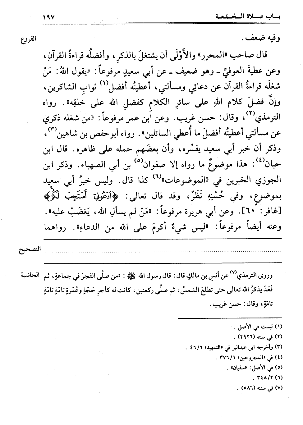 قَالَ صَاحِبُ الْمُحَرَّرِ: وَالْأَوْلَى أَنْ يَشْتَغِلَ بِالذِّكْرِ، وَأَفْضَلُهُ قِرَاءَةِ الْقُرْآنِ، وَعَنْ عَطِيَّةَ الْعَوْفِيِّ وَهُوَ ضَعِيفٌ عَنْ أُبَيٍّ سَعِيدٍ مَرْفُوعًا يَقُولُ اللَّهُ: مَنْ شَغَلَهُ قِرَاءَةُ الْقُرْآنِ عَنْ دُعَائِي وَمَسْأَلَتِي أَعْطَيْته أَفْضَلَ1 ثَوَابِ الشَّاكِرِينَ، وَإِنَّ فَضْلَ كَلَامِ اللَّهِ عَلَى سَائِرِ الْكَلَامِ كَفَضْلِ اللَّهِ عَلَى خَلْقِهِ. رَوَاهُ التِّرْمِذِيُّ2، وَقَالَ: حَسَنٌ غَرِيبٌ، وَعَنْ ابْنِ عُمَرَ مَرْفُوعًا مَنْ شَغَلَهُ ذِكْرِي عَنْ مَسْأَلَتِي أَعْطَيْته أَفْضَلَ مَا أُعْطِي السَّائِلِينَ رَوَاهُ أَبُو حَفْصِ بْنُ شَاهِينِ3، وَذَكَرَ أَنَّ خَبَرَ أَبِي سَعِيدٍ يُفَسِّرُهُ، وَأَنَّ بَعْضَهُمْ حَمَلَهُ عَلَى ظَاهِرِهِ، قَالَ ابْنُ حِبَّانَ4: هَذَا مَوْضُوعُ مَا رَوَاهُ إلَّا صَفْوَانُ5 بْنُ أَبِي الصَّهْبَاءِ، وَذَكَرَ ابْنُ الْجَوْزِيِّ الْخَبَرَيْنِ فِي الْمَوْضُوعَاتِ6، كَذَا قَالَ، وَلَيْسَ خَبَرُ أَبِي سَعِيدٍ بِمَوْضُوعٍ، وَفِي حُسْنِهِ نَظَرٌ، وَقَالَ تَعَالَى: {ادْعُونِي أَسْتَجِبْ لَكُمْ} [غافر: 60] وَعَنْ أَبِي هُرَيْرَةَ مَرْفُوعًا مَنْ لَمْ يَسْأَلْ اللَّهَ يَغْضَبْ عَلَيْهِ وَعَنْهُ أَيْضًا مَرْفُوعًا لَيْسَ شَيْءٌ أَكْرَمَ عَلَى اللَّهِ مِنْ الدعاء. رواهما