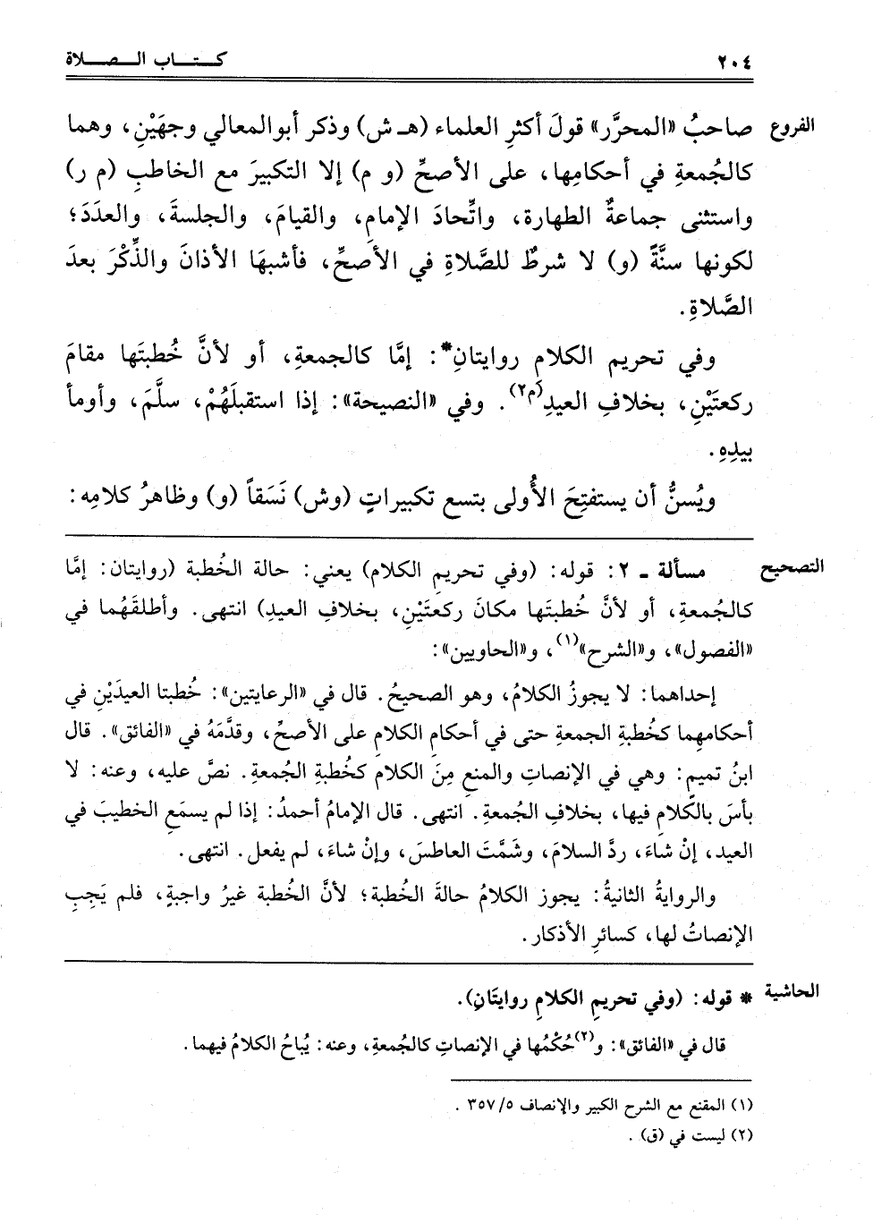 ـــــــــــــــــــــــــــــQمَسْأَلَةٌ - 2: قَوْلُهُ: وَفِي تَحْرِيمِ الْكَلَامِ يَعْنِي حَالَ الْخُطْبَةِ رِوَايَتَانِ، إمَّا كَالْجُمُعَةِ، أَوْ لِأَنَّ خُطْبَتَهَا مَكَانَ رَكْعَتَيْنِ، بِخِلَافِ الْعِيدِ، انْتَهَى. وَأَطْلَقَهُمَا فِي الْفُصُولِ وَالشَّرْحْ1، وَالْحَاوِيَيْنِ.