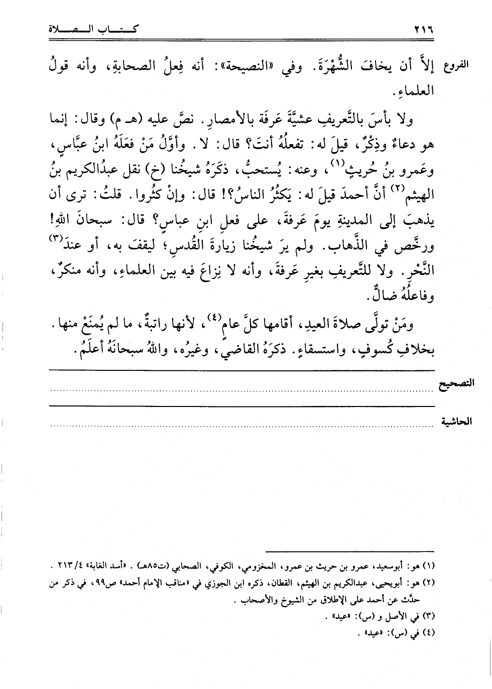 وَلَا بَأْسَ بِالتَّعْرِيفِ عَشِيَّةَ عَرَفَةَ بِالْأَمْصَارِ، نَصَّ عَلَيْهِ "هـ م" وَقَالَ: إنَّمَا هُوَ دُعَاءٌ وَذِكْرٌ، قِيلَ لَهُ: تَفْعَلُهُ أَنْتَ؟ قَالَ: لَا، وَأَوَّلُ مَنْ فعله ابن عباس وعمرو بن حريث1، وعنه: يُسْتَحَبُّ، ذَكَرَهُ شَيْخُنَا "خ" نَقَلَ عَبْدُ الْكَرِيمِ بْنُ الْهَيْثَمِ2 أَنَّ أَحْمَدَ قِيلَ لَهُ: يَكْثُرُ النَّاسُ، قَالَ: وَإِنْ كَثُرُوا. قُلْت: تَرَى أَنْ يَذْهَبَ إلَى الْمَدِينَةِ يَوْمَ عَرَفَةَ عَلَى فِعْلِ ابْنِ عَبَّاسٍ؟ قَالَ: سُبْحَانَ اللَّهِ. وَرَخَّصَ فِي الذَّهَابِ، وَلَمْ يَرَ شَيْخُنَا زِيَارَةَ الْقُدْسِ لِيَقِفَ به، أو عند النَّحْرِ3، وَلَا التَّعْرِيفَ بِغَيْرِ عَرَفَةَ، وَأَنَّهُ لَا نِزَاعَ فِيهِ بَيْنَ الْعُلَمَاءِ، وَأَنَّهُ مُنْكَرٌ، وَفَاعِلُهُ ضَالٌّ.