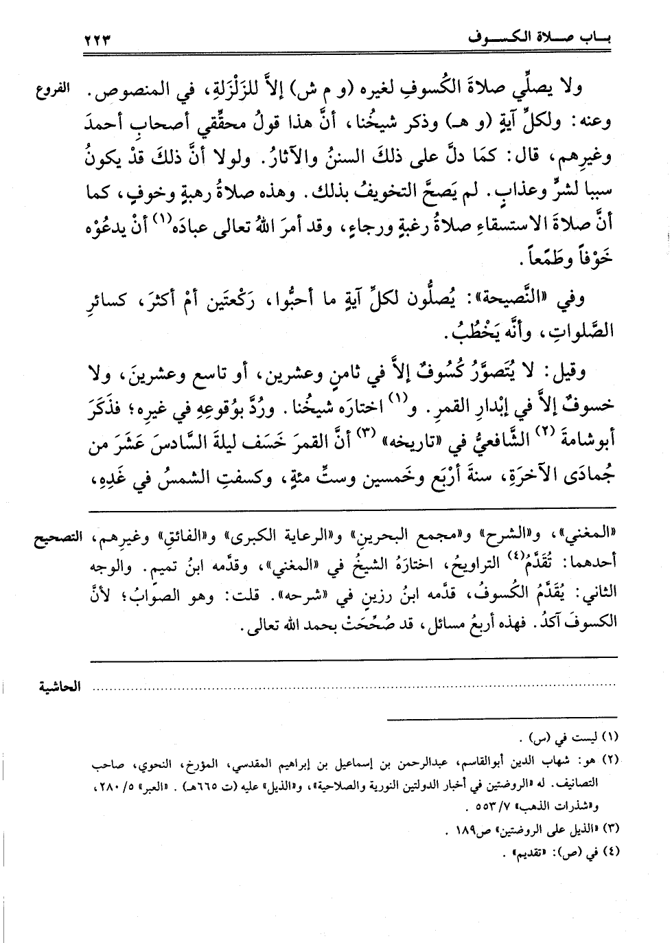 ـــــــــــــــــــــــــــــQ"الْمُغْنِي"، وَالشَّرْحِ وَمَجْمَعِ الْبَحْرَيْنِ وَالرِّعَايَةِ الْكُبْرَى وَالْفَائِقِ وَغَيْرِهِمْ، أَحَدُهُمَا تُقَدَّمُ4 التَّرَاوِيحُ، اخْتَارَهُ الشَّيْخُ فِي الْمُغْنِي، وَقَدَّمَهُ ابْنُ تَمِيمٍ، وَالْوَجْهُ الثَّانِي يُقَدَّمُ الْكُسُوفُ، قَدَّمَهُ ابْنُ رَزِينٍ فِي شَرْحِهِ "قُلْت": وَهُوَ الصَّوَابُ؛ لِأَنَّ الْكُسُوفَ آكَدُ، فَهَذِهِ أَرْبَعُ مسائل قد صححت بحمد الله تعالى.