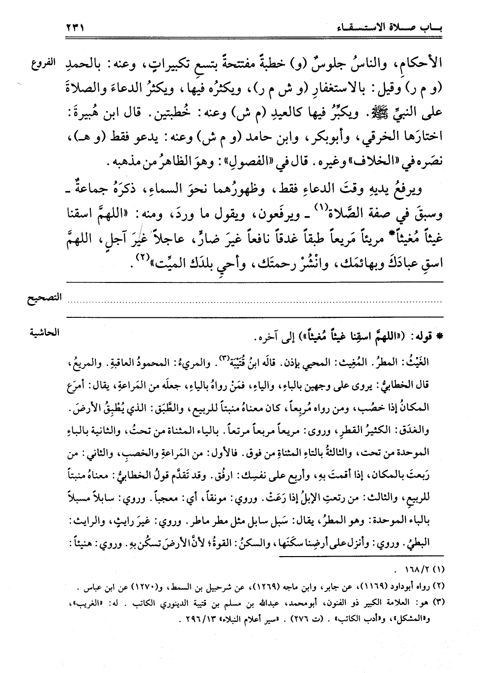وَيَرْفَعُ يَدَيْهِ وَقْتَ الدُّعَاءِ فَقَطْ وَظُهُورُهُمَا نَحْوَ السَّمَاءِ، ذَكَرَهُ جَمَاعَةٌ وَسَبَقَ فِي صِفَةِ الصَّلَاةِ1 وَيَرْفَعُونَ، وَيَقُولُ مَا وَرَدَ، وَمِنْهُ: "اللَّهُمَّ اسْقِنَا غَيْثًا مُغِيثًا مَرِيئًا مَرِيعًا طَبَقًا غَدَقًا نَافِعًا غَيْرَ ضَارٍ، عَاجِلًا غَيْرَ آجِلٍ، اللَّهُمَّ اسْقِ عِبَادَك وَبَهَائِمَك، وانشر رحمتك، وأحي بلدك الميت" 2.