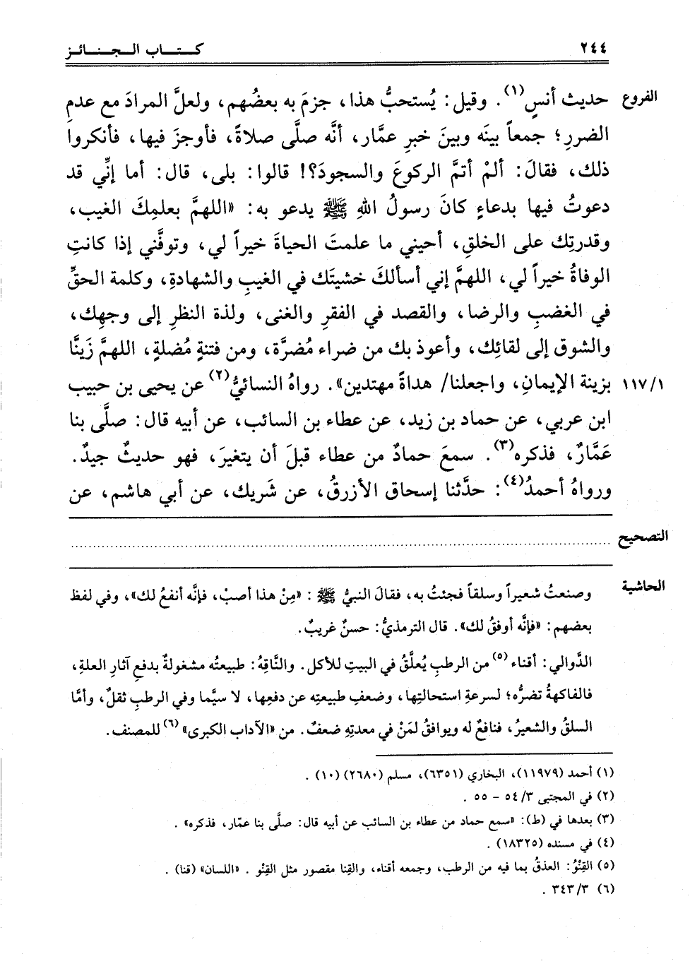 حَدِيثِ أَنَسٍ1. وَقِيلَ: يُسْتَحَبُّ هَذَا، جَزَمَ بِهِ بَعْضُهُمْ، وَلَعَلَّ الْمُرَادَ: مَعَ عَدَمِ الضَّرَرِ، جَمَعَا بَيْنَهُ وَبَيْنَ خَبَرِ عَمَّارٍ أَنَّهُ صَلَّى صَلَاةً فَأَوْجَزَ فِيهَا، فَأَنْكَرُوا ذَلِكَ، فَقَالَ: أَلَمِ أُتِمَّ الرُّكُوعَ وَالسُّجُودَ؟ قَالُوا: بَلَى، قَالَ: أَمَّا إنِّي قَدْ دَعَوْت فِيهَا بِدُعَاءٍ كَانَ رَسُولُ اللَّهِ صَلَّى اللَّهُ عَلَيْهِ وَسَلَّمَ يَدْعُو بِهِ: "اللَّهُمَّ بِعِلْمِك الْغَيْبَ، وَقُدْرَتِك عَلَى الْخَلْقِ، أَحْيِنِي مَا عَلِمْت الْحَيَاةَ خَيْرًا لِي، وَتَوَفَّنِي، إذَا كَانَتْ الْوَفَاةُ خَيْرًا لِي، اللَّهُمَّ إنِّي أَسْأَلُك خَشْيَتَك فِي الْغَيْبِ وَالشَّهَادَةِ، وَكَلِمَةَ الْحَقِّ فِي الْغَضَبِ وَالرِّضَا، وَالْقَصْدَ فِي الْفَقْرِ وَالْغِنَى، وَلَذَّةَ النَّظَرِ إلَى وَجْهِك، وَالشَّوْقَ إلَى لِقَائِك، وَأَعُوذُ بِك مِنْ ضَرَّاءَ مُضِرَّةٍ، وَمِنْ فِتْنَةٍ مُضِلَّةٍ، اللَّهُمَّ زَيِّنَّا بِزِينَةِ الْإِيمَانِ، وَاجْعَلْنَا هُدَاةً مُهْتَدِينَ"، رَوَاهُ النَّسَائِيُّ2 عَنْ يَحْيَى بْنِ حَبِيبِ بْنِ عَرَبِيٍّ عَنْ حَمَّادِ بْنِ زَيْدٍ عَنْ عَطَاءِ بْنِ السَّائِبِ عَنْ أَبِيهِ قَالَ: صَلَّى بِنَا عَمَّارٌ، فَذَكَرَهُ3. سَمِعَ حَمَّادٌ مِنْ عَطَاءٍ قَبْلَ أَنْ يَتَغَيَّرَ، فَهُوَ حَدِيثٌ جَيِّدٌ. وَرَوَاهُ أَحْمَدُ4: حَدَّثَنَا إِسْحَاقُ الْأَزْرَقُ، عَنْ شَرِيكٍ، وَعَنْ أَبِي هَاشِمٍ، عن