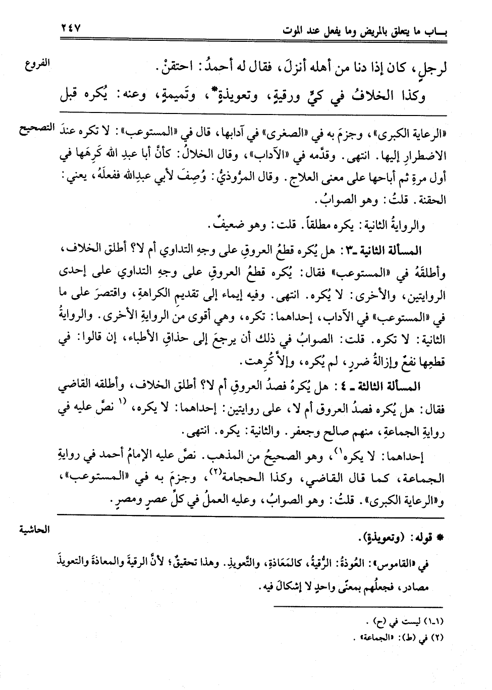 الْمَسْأَلَةُ الثَّانِيَةُ - 3: هَلْ يُكْرَهُ قَطْعُ الْعُرُوقِ عَلَى وَجْهِ التَّدَاوِي أَمْ لَا؟ أُطْلِقَ الْخِلَافُ وَأَطْلَقَهُ فِي الْمُسْتَوْعِبِ فَقَالَ: يُكْرَهُ قَطْعُ الْعُرُوقِ عَلَى وَجْهِ التَّدَاوِي عَلَى إحْدَى الرِّوَايَتَيْنِ، وَالْأُخْرَى لَا يُكْرَهُ، انْتَهَى. وَفِيهِ إيمَاءٌ إلَى تَقْدِيمِ الْكَرَاهَةِ، وَاقْتَصَرَ عَلَى مَا فِي الْمُسْتَوْعِبِ فِي الْآدَابِ، إحْدَاهُمَا تُكْرَهُ، وَهُوَ أَقْوَى مِنْ الرِّوَايَةِ الْأُخْرَى، وَالرِّوَايَةُ الثَّانِيَةُ لَا تُكْرَهُ، قُلْت: الصَّوَابُ فِي ذَلِكَ أَنْ يَرْجِعَ إلَى حُذَّاقِ الْأَطِبَّاءِ، إنْ قَالُوا فِي قَطْعِهَا نَفْعٌ وَإِزَالَةُ ضَرَرٍ لَمْ يُكْرَهْ، وَإِلَّا كُرِهَتْ.