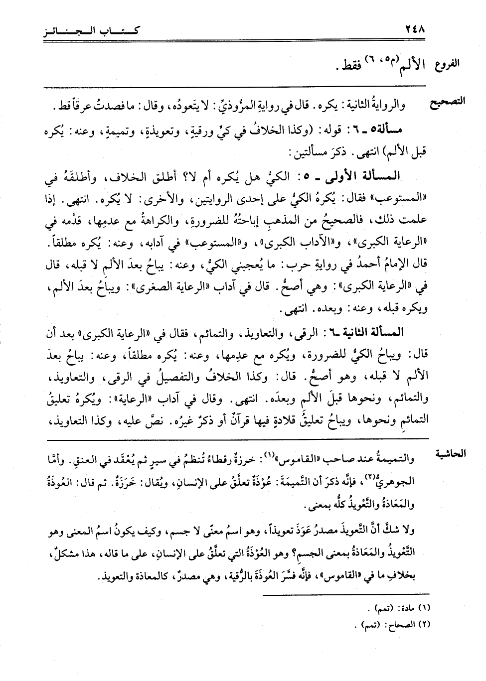مَسْأَلَةٌ 5 - 6: قَوْلُهُ: وَكَذَا الْخِلَافُ فِي كَيٍّ وَرُقْيَةٍ وَتَعْوِيذَةٍ وَتَمِيمَةٍ، وَعَنْهُ: يُكْرَهُ قَبْلَ الْأَلَمِ، انْتَهَى ذِكْرُ مَسْأَلَتَيْنِ: