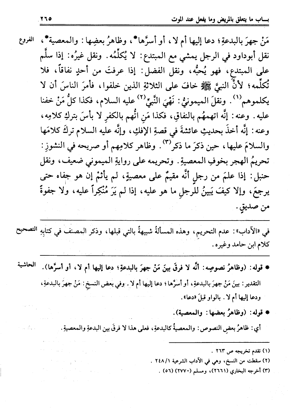 مَنْ جَهَرَ بِالْبِدْعَةِ دَعَا إلَيْهَا أَمْ لَا أَوْ أَسَرَّهَا، وَظَاهِرُ بَعْضِهَا: وَالْمَعْصِيَةُ، نَقَلَ أَبُو دَاوُد فِي الرَّجُلِ يَمْشِي مَعَ الْمُبْتَدِعِ: لَا يُكَلِّمُهُ. وَنَقَلَ غَيْرُهُ: إذَا سَلَّمَ عَلَى الْمُبْتَدِعِ فَهُوَ يُحِبُّهُ، وَنَقَلَ الْفَضْلُ: إذَا عَرَفْت مِنْ أَحَدٍ نِفَاقًا فَلَا تُكَلِّمُهُ لِأَنَّ النَّبِيَّ صَلَّى اللَّهُ عَلَيْهِ وَسَلَّمَ خَافَ عَلَى الثَّلَاثَةِ الَّذِينَ خُلِّفُوا فَأَمَرَ النَّاسَ أَنْ لَا يُكَلِّمُوهُمْ1. وَنَقَلَ الميموني: نهى النبي2 عَلَيْهِ السَّلَامُ، فَكَذَا كُلُّ مَنْ خِفْنَا عَلَيْهِ، وَعَنْهُ: إنَّهُ اتَّهَمَهُمْ بِالنِّفَاقِ، فَكَذَا مَنْ اُتُّهِمَ بِالْكُفْرِ لَا بَأْسَ بِتَرْكِ كَلَامِهِ، وَعَنْهُ: إنَّهُ أَخَذَ بِحَدِيثِ عَائِشَةَ فِي قِصَّةِ الْإِفْكِ، وَإِنَّهُ عَلَيْهِ السَّلَامُ تَرَكَ كَلَامَهَا وَالسَّلَامَ عَلَيْهَا حِينَ ذُكِرَ مَا ذُكِرَ3، وَظَاهِرُ كَلَامِهِمْ أَوْ صَرِيحُهُ فِي النُّشُوزِ تَحْرِيمُ الْهَجْرِ بِخَوْفِ الْمَعْصِيَةِ، وَتَحْرِيمُهُ عَلَى رِوَايَةِ الْمَيْمُونِيِّ ضَعِيفٌ، وَنَقَلَ حَنْبَلٌ: إذَا عُلِمَ مِنْ الرَّجُلِ أَنَّهُ مُقِيمٌ عَلَى مَعْصِيَةٍ لَمْ يَأْثَمْ إنْ هُوَ جَفَاهُ حَتَّى يَرْجِعَ، وَإِلَّا كَيْفَ يَبِينُ لِلرَّجُلِ مَا هُوَ عَلَيْهِ إذَا لَمْ يَرَ مُنْكَرًا عَلَيْهِ، وَلَا جَفْوَةً من صديق.