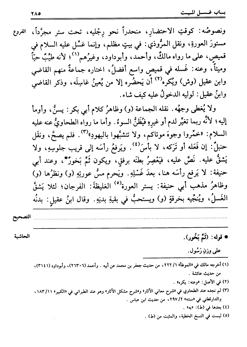 وَنُصُوصُهُ: كَوَقْتِ الِاحْتِضَارِ، مُنْحَدِرًا نَحْوَ رِجْلَيْهِ، تَحْتَ سِتْرٍ مُجَرَّدًا، مَسْتُورَ الْعَوْرَةِ، وَنَقَلَ الْمَرُّوذِيُّ: فِي بَيْتٍ مُظْلِمٍ، وَإِنَّمَا غُسِّلَ عَلَيْهِ السَّلَامُ فِي قَمِيصٍ عَلَى مَا رَوَاهُ مَالِكٌ وَأَحْمَدُ وَأَبُو دَاوُد وَغَيْرُهُمْ1؛ لِأَنَّهُ طَيِّبٌ حَيًّا وَمَيِّتًا، وَعَنْهُ غُسْلُهُ فِي قَمِيصٍ وَاسِعٍ أَفْضَلُ، اخْتَارَهُ جَمَاعَةٌ مِنْهُمْ الْقَاضِي وَابْنُ عَقِيلٍ "وش" وَيُكْرَهُ2 أَنْ يُحْضِرَهُ إلَّا مَنْ يُعَيِّنُ غَاسِلُهُ وَذَكَرَ الْقَاضِي وابن عقيل لِوَلِيِّهِ الدُّخُولُ عَلَيْهِ كَيْفَ شَاءَ.