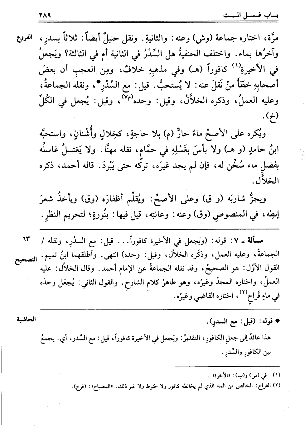 ـــــــــــــــــــــــــــــQمَسْأَلَةٌ - 7: قَوْلُهُ وَيَجْعَلُ فِي الْأَخِيرَةِ كَافُورًا قِيلَ: مَعَ السِّدْرِ، وَنَقَلَهُ الْجَمَاعَةُ، وَعَلَيْهِ الْعَمَلُ، وَذَكَرَهُ الْخَلَّالُ، وَقِيلَ: وَحْدَهُ، انْتَهَى. وَأَطْلَقَهُمَا ابْنُ تَمِيمٍ، الْقَوْلُ الْأَوَّلُ هُوَ الصَّحِيحُ، وَقَدْ نَقَلَهُ الْجَمَاعَةُ عَنْ الْإِمَامِ أَحْمَدَ. وَقَالَ الْخَلَّالُ: عَلَيْهِ الْعَمَلُ، وَاخْتَارَهُ الْمَجْدُ وَغَيْرُهُ، وَهُوَ ظَاهِرُ كَلَامِ الشَّارِحِ، وَالْقَوْلُ الثَّانِي: يُجْعَلُ وَحْدَهُ فِي مَاءٍ قَرَاحٍ2، اختاره القاضي وغيره.