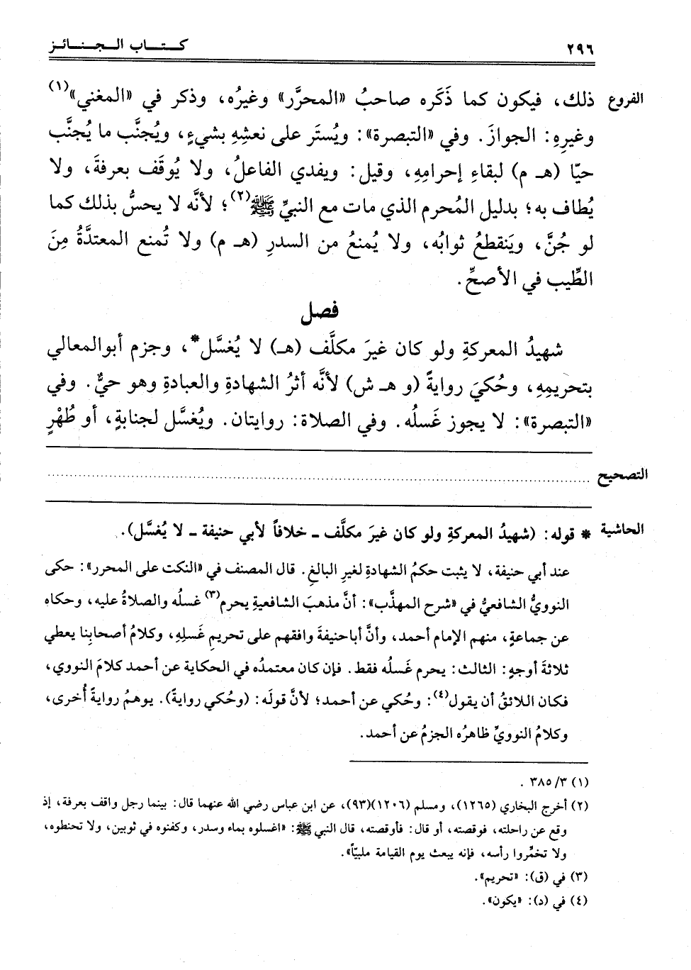 ذَلِكَ، فَيَكُونُ كَمَا ذَكَرَهُ صَاحِبُ الْمُحَرَّرِ وَغَيْرُهُ، وَذَكَرَ فِي الْمُغْنِي1 وَغَيْرِهِ الْجَوَازَ. وَفِي التَّبْصِرَةِ: وَيَسْتُرُ عَلَى نَعْشِهِ بِشَيْءٍ، وَيُجَنَّبُ مَا يَجْتَنِبُ حَيًّا "هـ م" لِبَقَاءِ إحْرَامِهِ، وَقِيلَ: يَفْدِي الْفَاعِلُ، وَلَا يُوقَفُ بِعَرَفَةَ، وَلَا يُطَافُ "بِهِ" بِدَلِيلِ الْمُحْرِمِ الَّذِي مَاتَ مَعَ النَّبِيِّ صَلَّى اللَّهُ عَلَيْهِ وَسَلَّمَ2؛ وَلِأَنَّهُ لَا يُحِسُّ بِذَلِكَ كَمَا لَوْ جُنَّ، وَيَنْقَطِعُ ثَوَابُهُ وَلَا يُمْنَعُ مِنْ السِّدْرِ "هـ م" وَلَا تُمْنَعُ الْمُعْتَدَّةُ من الطيب في الأصح.