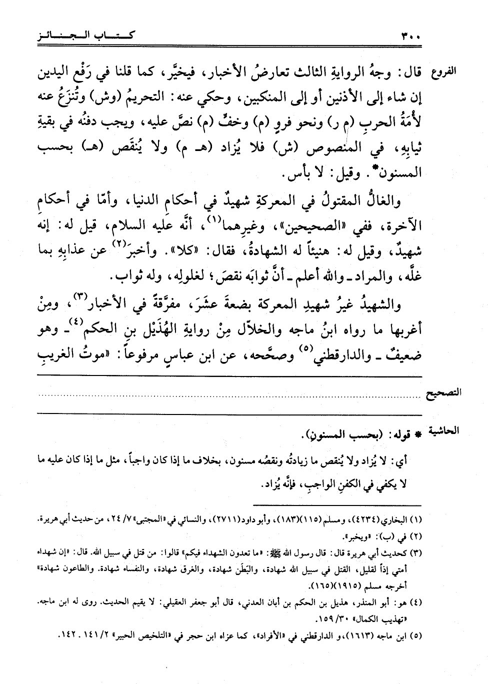 قَالَ: وَجْهُ الرِّوَايَةِ الثَّالِثَةِ تَعَارُضُ الْأَخْبَارِ فَيُخَيَّرُ، كَمَا قُلْنَا فِي رَفْعِ الْيَدَيْنِ إنْ شَاءَ إلَى الْأُذُنَيْنِ أَوْ إلَى الْمَنْكِبَيْنِ، وَحُكِيَ عَنْهُ التَّحْرِيمُ "وش" وَتُنْزَعُ عَنْهُ لَامَةُ الْحَرْبِ "م ر" وَنَحْوُ فَرْوَةٍ وَخُفٍّ، نَصَّ عَلَيْهِ "م" وَيَجِبُ دَفْنُهُ فِي بَقِيَّةِ ثِيَابِهِ، فِي الْمَنْصُوصِ "ش" فَلَا يُزَادُ "هـ م" وَلَا يُنْقَصُ "هـ" بِحَسْبِ الْمَسْنُونِ. وَقِيلَ: لَا بَأْسَ.