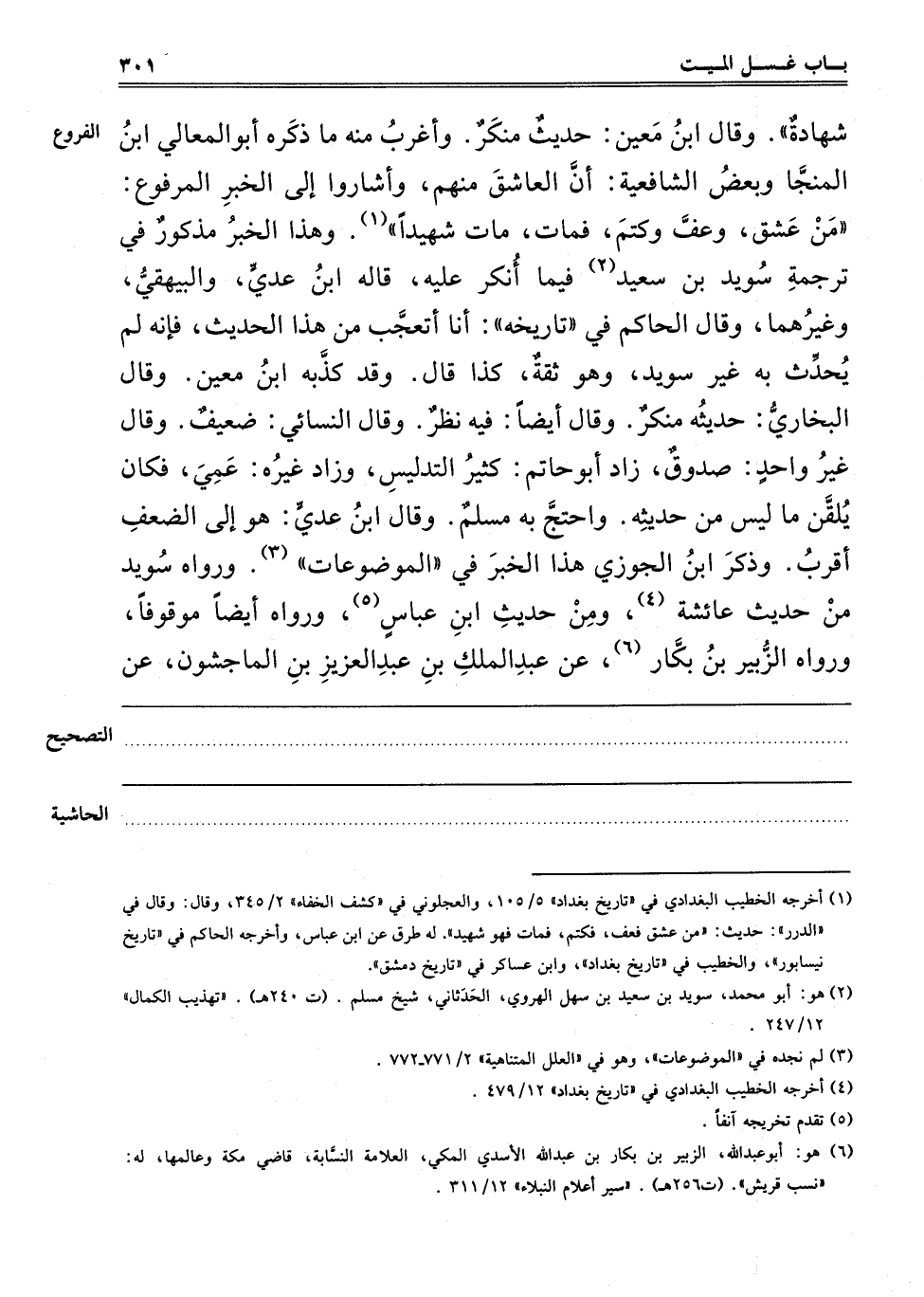 شَهَادَةٌ". وَقَالَ ابْنُ مَعِينٍ: حَدِيثٌ مُنْكَرٌ، وَأَغْرَبُ مِنْهُ مَا ذَكَرَهُ أَبُو الْمَعَالِي بْنُ الْمُنَجَّى وَبَعْضُ الشَّافِعِيَّةِ: أَنَّ الْعَاشِقَ مِنْهُمْ. وَأَشَارُوا إلَى الْخَبَرِ الْمَرْفُوعِ: "مَنْ عَشِقَ وَعَفَّ وَكَتَمَ فَمَاتَ مَاتَ شَهِيدًا" 1. وَهَذَا الْخَبَرُ مَذْكُورٌ فِي تَرْجَمَةِ سُوَيْد بْنِ سَعِيدٍ2 فِيمَا أُنْكِرَ عَلَيْهِ، قَالَهُ ابْنُ عَدِيٍّ وَالْبَيْهَقِيُّ وَغَيْرُهُمَا. وَقَالَ الْحَاكِمُ فِي تَارِيخِهِ: أَنَا أَتَعَجَّبُ مِنْ هَذَا الْحَدِيثِ، فَإِنَّهُ لَمْ يُحَدِّثْ بِهِ غَيْرُ سُوَيْدٍ، وَهُوَ ثِقَةٌ، كَذَا قَالَ، وَقَدْ كَذَّبَهُ ابْنُ مَعِينٍ. وَقَالَ الْبُخَارِيُّ: حَدِيثُهُ مُنْكَرٌ. وَقَالَ أَيْضًا: فِيهِ نَظَرٌ، وَقَالَ النَّسَائِيُّ: ضَعِيفٌ، وَقَالَ غَيْرُ وَاحِدٍ: صَدُوقٌ، زَادَ أَبُو حَاتِمٍ: كَثِيرُ التَّدْلِيسِ، وَزَادَ غَيْرُهُ: عَمِيَ فَكَانَ يُلَقَّنُ مَا لَيْسَ مِنْ حَدِيثِهِ، وَاحْتَجَّ بِهِ مُسْلِمٌ. وَقَالَ ابْنُ عَدِيٍّ: هُوَ إلَى الضَّعْفِ أَقْرَبُ، وَذَكَرَ ابْنُ الْجَوْزِيِّ هَذَا الْخَبَرَ فِي الْمَوْضُوعَاتِ3. وَرَوَاهُ سُوَيْد مِنْ حَدِيثِ عَائِشَةَ4، وَمِنْ حَدِيثِ ابْنِ عَبَّاسٍ5، وَرَوَاهُ أَيْضًا مَوْقُوفًا، وَرَوَاهُ الزُّبَيْرُ بْنُ بَكَّارٍ6، عَنْ عَبْدِ الْمَلِكِ بْنِ عَبْدِ الْعَزِيزِ بْنِ الْمَاجِشُونِ، عَنْ