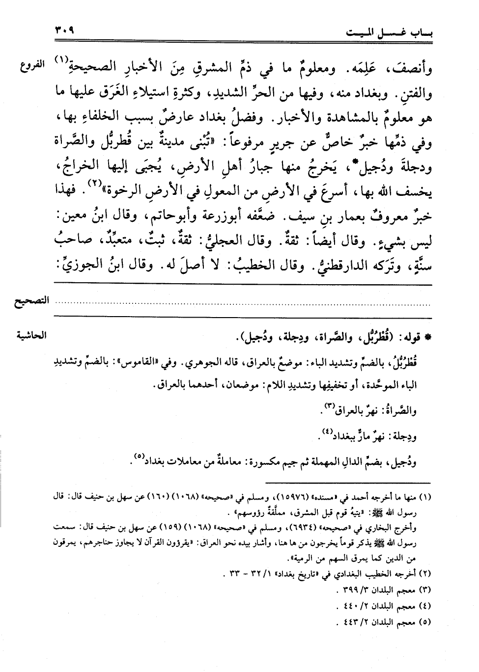 وَأَنْصَفَ عَلِمَهُ. وَمَعْلُومٌ مَا فِي ذَمِّ الْمَشْرِقِ مِنْ الْأَخْبَارِ الصَّحِيحَةِ1 وَالْفِتَنِ. وَبَغْدَادُ مِنْهُ، وَفِيهَا مِنْ الْحَرِّ الشَّدِيدِ وَكَثْرَةِ اسْتِيلَاءِ الْغَرَقِ عَلَيْهَا مَا هُوَ مَعْلُومٌ بِالْمُشَاهَدَةِ وَالْأَخْبَارِ وَفَضْلُ بَغْدَادَ عَارِضٌ بِسَبَبِ الْخُلَفَاءِ بِهَا، وَفِي ذَمِّهَا خَبَرٌ خَاصٌّ عَنْ جَرِيرٍ مَرْفُوعًا: "تُبْنَى مَدِينَةٌ بَيْنَ قُطْرَبُّلَ وَالصَّرَاةِ وَدِجْلَةُ وَدُجَيْلٌ، يَخْرُجُ مِنْهَا جَبَّارُ أَهْلِ الْأَرْضِ، يُجْبَى إلَيْهَا الْخَرَاجُ، يَخْسِفُ اللَّهُ بِهَا، أَسْرَعُ فِي الْأَرْضِ مِنْ الْمِعْوَلِ فِي الْأَرْضِ الرَّخْوَةِ" 2. فَهَذَا خَبَرٌ مَعْرُوفٌ بِعَمَّارِ بْنِ سَيْفٍ، وَضَعَّفَهُ أَبُو زُرْعَةَ وَأَبُو حَاتِمٍ. وَقَالَ ابْنُ مَعِينٍ: لَيْسَ بِشَيْءٍ، وَقَالَ أَيْضًا: ثِقَةٌ. وَقَالَ الْعِجْلِيُّ: ثِقَةٌ ثَبْتٌ مُتَعَبِّدٌ صَاحِبَ سُنَّةٍ، وَتَرَكَهُ الدَّارَقُطْنِيُّ. وَقَالَ الْخَطِيبُ: لَا أَصْلَ لَهُ، وقال ابن الجوزي: