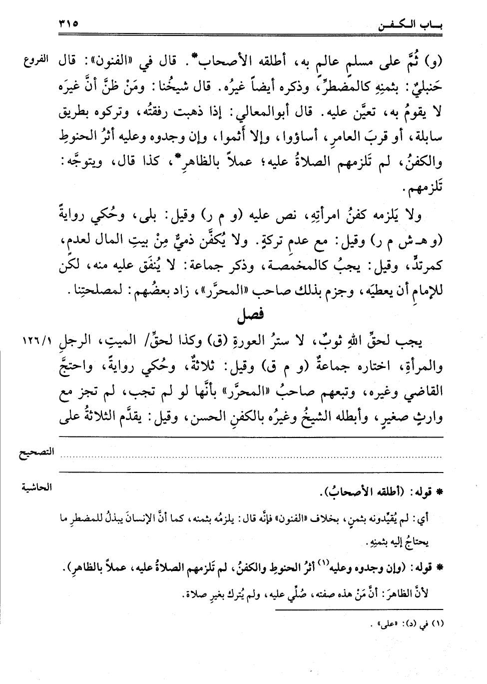 "و" ثُمَّ عَلَى مُسْلِمٍ عَالِمٍ بِهِ، أَطْلَقَهُ الْأَصْحَابُ، قَالَ فِي الْفُنُونِ: قَالَ حَنْبَلٌ: بِثَمَنِهِ كَالْمُضْطَرِّ، وَذَكَرَهُ أَيْضًا غَيْرُهُ، قَالَ شَيْخُنَا: وَمَنْ ظَنَّ أَنَّ غَيْرَهُ لَا يَقُومُ بِهِ تَعَيَّنَ عَلَيْهِ، قَالَهُ أَبُو الْمَعَالِي: إذَا ذَهَبَتْ رِفْقَتُهُ وَتَرَكُوهُ بِطَرِيقٍ سَابِلَةٍ أَوْ قُرْبِ الْعَامِرِ أَسَاءُوا وَإِلَّا أَثِمُوا، وَإِنْ وَجَدُوهُ وَعَلَيْهِ أَثَرُ الْحَنُوطِ وَالْكَفَنِ لَمْ تَلْزَمْهُمْ الصَّلَاةُ عَلَيْهِ، عَمَلًا بِالظَّاهِرِ، كَذَا قَالَ، وَيُتَوَجَّهُ تَلْزَمُهُمْ.