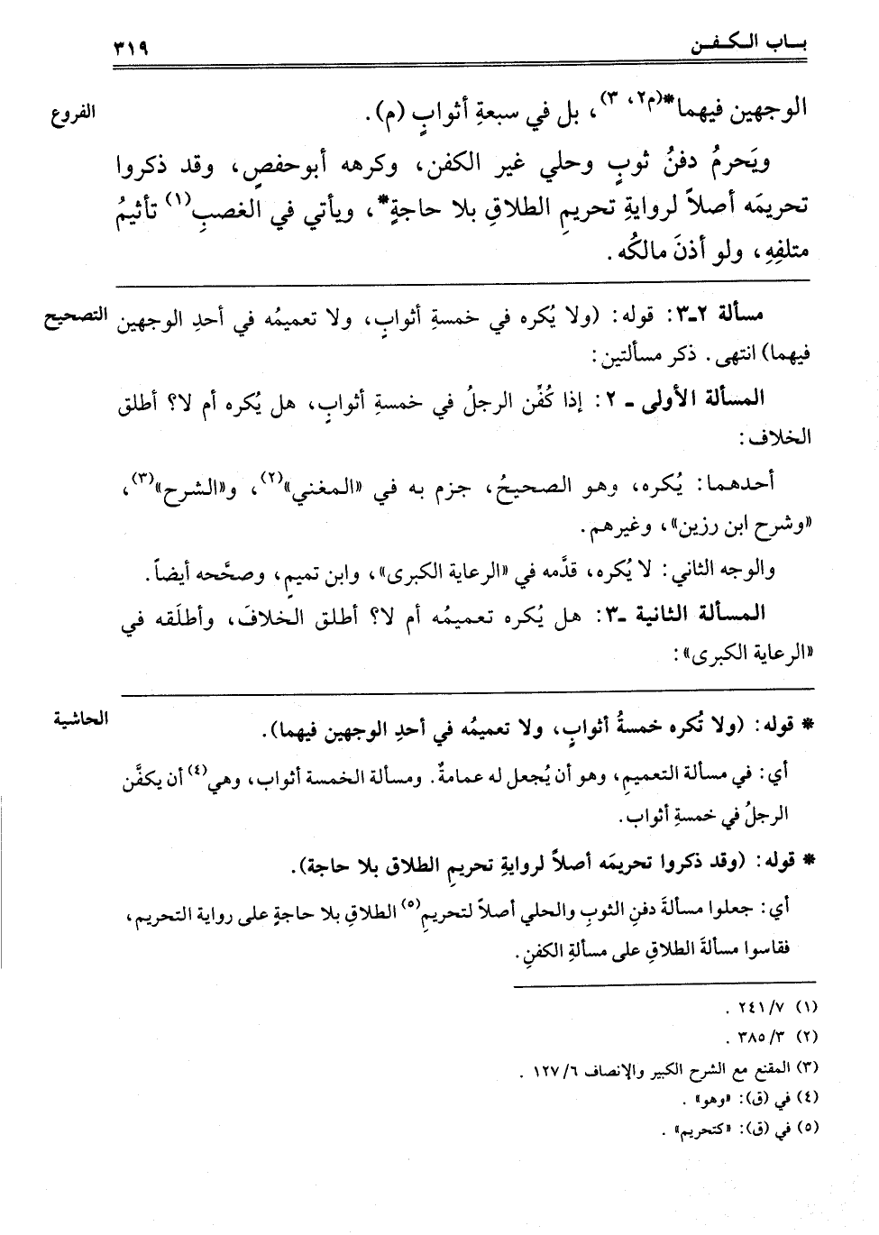 الْمَسْأَلَةُ الْأُولَى - 2: إذَا كُفِّنَ الرَّجُلُ فِي خَمْسَةِ أَثْوَابٍ هَلْ يُكْرَهُ أَمْ لَا؟ أُطْلِقَ الْخِلَافُ: