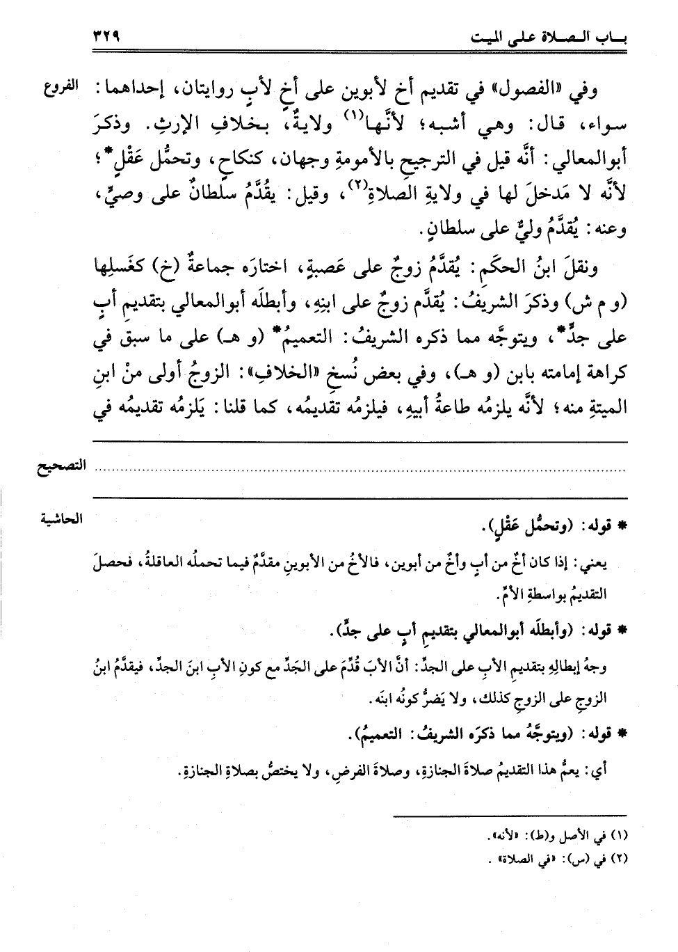 وَنَقَلَ ابْنُ الْحَكَمِ: يُقَدَّمُ زَوْجٌ عَلَى عَصَبَةٍ، اخْتَارَهُ جَمَاعَةٌ "خ" كَغُسْلِهَا "وم ش" وَذَكَرَ الشَّرِيفُ: يُقَدَّمُ زَوْجٌ عَلَى ابْنِهِ، وَأَبْطَلَهُ أَبُو الْمَعَالِي بِتَقْدِيمِ أَبٍ عَلَى جَدٍّ، وَيَتَوَجَّهُ مِمَّا ذَكَرَهُ الشَّرِيفُ التَّعْمِيمَ "وهـ" عَلَى مَا سَبَقَ فِي كَرَاهَةِ إمَامَتِهِ بِأَبِيهِ "وهـ" وَفِي بَعْضِ نُسَخِ الْخِلَافِ: الزَّوْجُ أَوْلَى مِنْ ابْنِ الْمَيِّتَةِ "مِنْهُ" لِأَنَّهُ يَلْزَمُهُ طَاعَةُ أَبِيهِ، فَيَلْزَمُهُ تَقْدِيمُهُ، كَمَا قُلْنَا: يَلْزَمُهُ تقديمه في