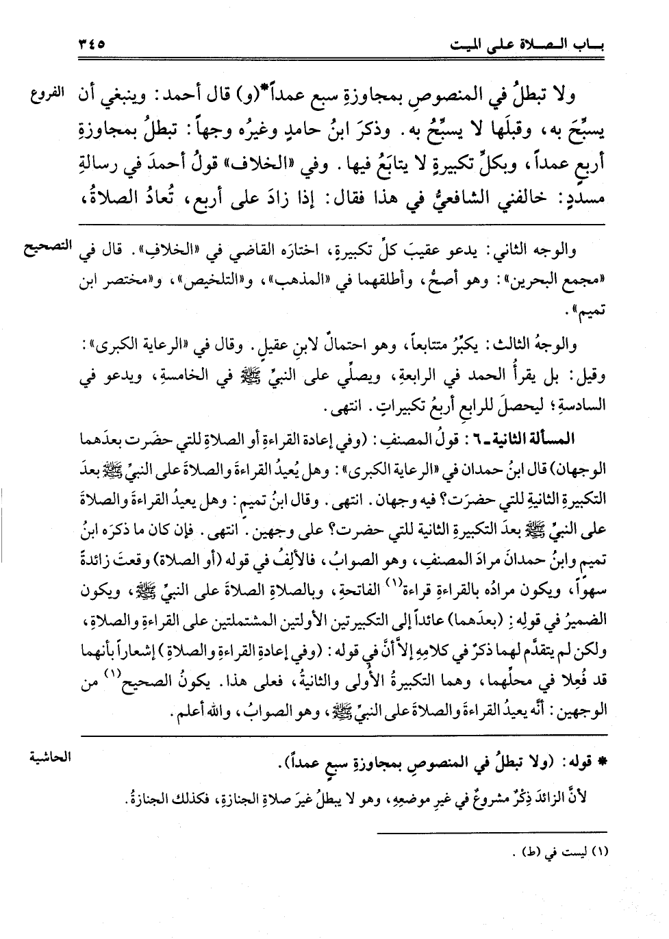 الْمَسْأَلَةُ الثَّانِيَةُ - 6: قَوْلُ الْمُصَنِّفِ: وَفِي إعَادَةِ الْقِرَاءَةِ أَوْ الصَّلَاةِ لِلَّتِي حَضَرَتْ بَعْدَهُمَا الْوَجْهَانِ، قَالَ ابْنُ حَمْدَانَ فِي الرِّعَايَةِ الْكُبْرَى وَهَلْ يُعِيدُ الْقِرَاءَةَ وَالصَّلَاةَ عَلَى النَّبِيِّ صَلَّى اللَّهُ عَلَيْهِ وَسَلَّمَ بَعْدَ التَّكْبِيرَةِ الثَّانِيَةِ لِلَّتِي حَضَرَتْ؟ فِيهِ وَجْهَانِ انْتَهَى. وَقَالَ ابْنُ تَمِيمٍ: وَهَلْ يُعِيدُ الْقِرَاءَةَ وَالصَّلَاةَ عَلَى النَّبِيِّ صَلَّى اللَّهُ عَلَيْهِ وَسَلَّمَ بَعْدَ التَّكْبِيرَةِ الثَّانِيَةِ لِلَّتِي حَضَرَتْ؟ عَلَى وَجْهَيْنِ، انْتَهَى، فَإِنْ كَانَ مَا ذَكَرَهُ ابْنُ تَمِيمٍ وَابْنُ حَمْدَانَ مُرَادَ الْمُصَنِّفِ، وَهُوَ الصَّوَابُ، فَالْأَلِفُ فِي قَوْلِهِ "أَوْ الصَّلَاةُ" وَقَعَتْ زَائِدَةً سهوا، ويكون مراده بالقراءة قراءة1 الْفَاتِحَةَ، وَبِالصَّلَاةِ الصَّلَاةَ عَلَى النَّبِيِّ صَلَّى اللَّهُ عَلَيْهِ وَسَلَّمَ وَيَكُونُ الضَّمِيرُ فِي قَوْلِهِ بَعْدَهُمَا، عَائِدًا إلَى التَّكْبِيرَتَيْنِ الْأُولَتَيْنِ الْمُشْتَمِلَتَيْنِ عَلَى الْقِرَاءَةِ وَالصَّلَاةِ، وَلَكِنْ لَمْ يَتَقَدَّمْ لَهُمَا ذِكْرٌ فِي كَلَامِهِ، إلَّا أَنَّ فِي قَوْلِهِ وَفِي إعَادَةِ الْقِرَاءَةِ أَوْ الصَّلَاةِ إشْعَارًا بِأَنَّهُمَا قَدْ فُعِلَا فِي مَحِلِّهِمَا، وَهُمَا التَّكْبِيرَةُ الْأُولَى وَالثَّانِيَةُ، فَعَلَى هذا يكون الصحيح1 مِنْ الْوَجْهَيْنِ: أَنَّهُ يُعِيدُ الْقِرَاءَةَ وَالصَّلَاةَ عَلَى النَّبِيِّ صَلَّى اللَّهُ عَلَيْهِ وَسَلَّمَ وَهُوَ الصَّوَابُ، والله أعلم.