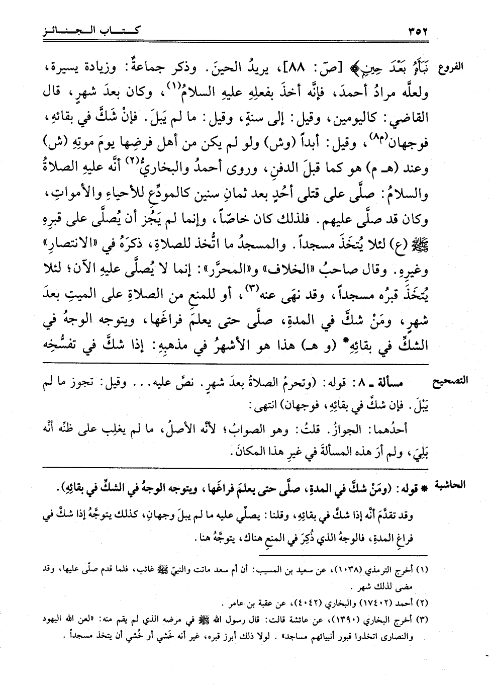 نَبَأَهُ بَعْدَ حِينٍ} [ص: 88] ، يُرِيدُ الْحِينَ، وَذَكَرَ جَمَاعَةٌ: وَزِيَادَةٌ يَسِيرَةٌ، وَلَعَلَّهُ مُرَادُ أَحْمَدَ، فَإِنَّهُ أَخَذَ بِفِعْلِهِ عَلَيْهِ السَّلَامُ1، وَكَانَ بَعْدَ شَهْرٍ، قَالَ الْقَاضِي: كَالْيَوْمَيْنِ، وَقِيلَ إلَى سَنَةٍ، وَقِيلَ: مَا لَمْ يَبْلَ. فَإِنْ شَكَّ فِي بَقَائِهِ فوجهان "م 8" وقيل: أبدا "وش" وَلَوْ لَمْ يَكُنْ مِنْ أَهْلِ فَرْضِهَا يَوْمَ مَوْتِهِ، "ش" وَعِنْدَ "هـ م" هُوَ كَمَا قبل الدفن، وروى أحمد والبخاري2 أَنَّهُ عَلَيْهِ الصَّلَاةُ وَالسَّلَامُ صَلَّى عَلَى قَتْلَى أُحُدٍ بَعْدَ ثَمَانِ سِنِينَ كَالْمُوَدِّعِ لِلْأَحْيَاءِ وَالْأَمْوَاتِ، وَكَانَ قَدْ صَلَّى عَلَيْهِمْ، فَلِذَلِكَ كَانَ خَاصًّا، وَإِنَّمَا لَمْ يَجُزْ أَنْ يُصَلِّيَ عَلَى قَبْرِهِ صَلَّى اللَّهُ عَلَيْهِ وَسَلَّمَ "ع" لِئَلَّا يُتَّخَذَ مَسْجِدًا، وَالْمَسْجِدُ مَا اُتُّخِذَ لِلصَّلَاةِ، ذَكَرَهُ فِي الِانْتِصَارِ وَغَيْرِهِ. وَقَالَ صَاحِبُ الْخِلَافِ وَالْمُحَرَّرِ: إنَّمَا لَا يُصَلَّى عَلَيْهِ الْآنَ لِئَلَّا يُتَّخَذَ قَبْرُهُ مَسْجِدًا، وَقَدْ نَهَى عَنْهُ3، أَوْ لِلْمَنْعِ مِنْ الصَّلَاةِ عَلَى الْمَيِّتِ بَعْدَ شَهْرٍ، وَمَنْ شَكَّ فِي الْمُدَّةِ صَلَّى حَتَّى يَعْلَمَ فَرَاغَهَا، وَيَتَّجِهُ الوجه في الشك في بقائه "وهـ" هَذَا هُوَ الْأَشْهَرُ فِي مَذْهَبِهِ: إذَا شَكَّ في تفسخه