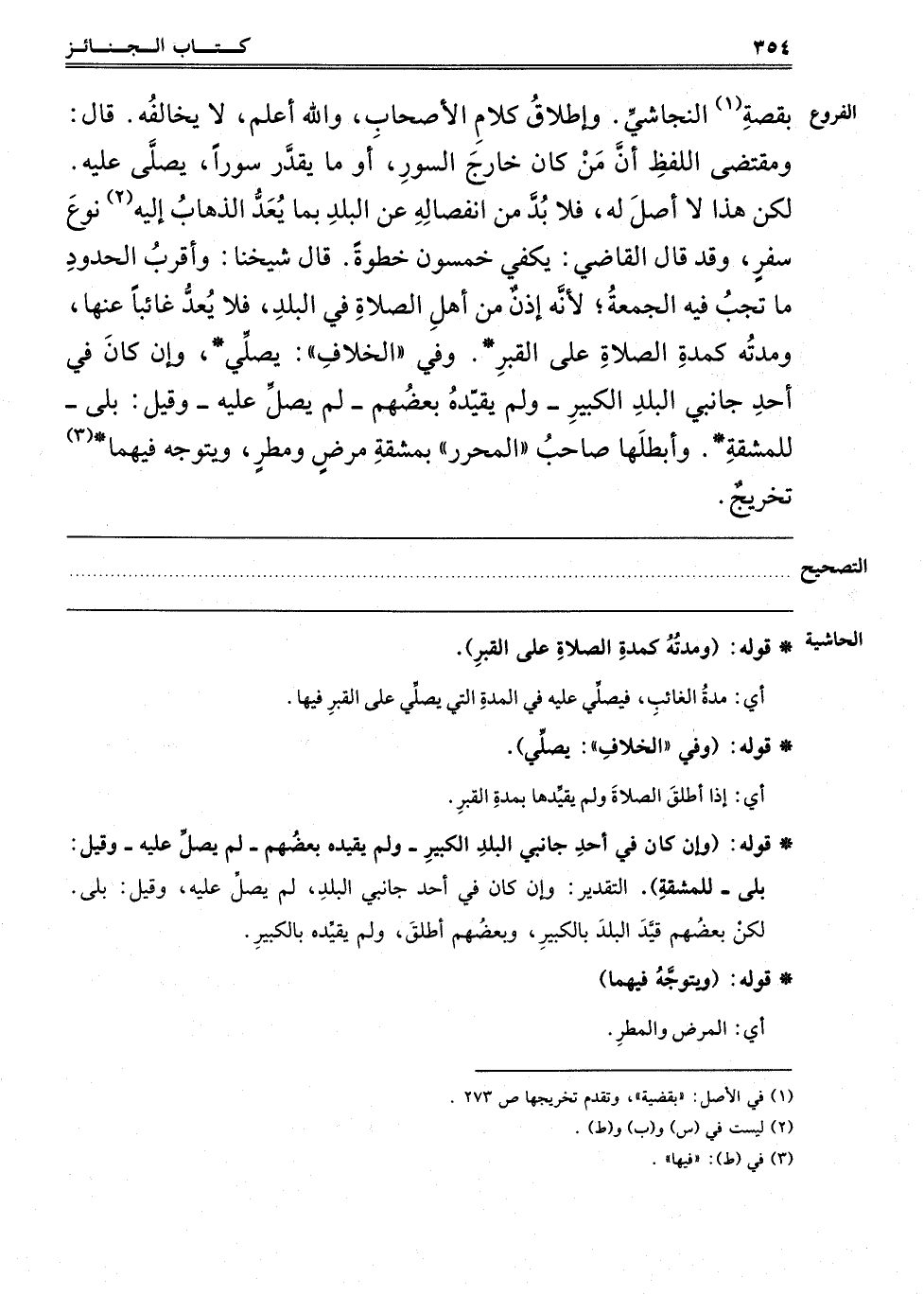 بِقِصَّةِ1 النَّجَاشِيِّ وَإِطْلَاقُ كَلَامِ الْأَصْحَابِ وَاَللَّهُ أَعْلَمُ لَا يُخَالِفُهُ، قَالَ: وَمُقْتَضَى اللَّفْظِ أَنَّ مَنْ كَانَ خَارِجَ السُّوَرِ أَوْ مَا يُقَدَّرُ سُوَرًا يُصَلَّى عَلَيْهِ، لَكِنَّ هَذَا لَا أَصْلَ لَهُ، فَلَا بُدَّ مِنْ انْفِصَالِهِ عَنْ الْبَلَدِ بِمَا يعد الذهاب إليه2 نَوْعَ سَفَرٍ، وَقَدْ قَالَ الْقَاضِي: يَكْفِي خَمْسُونَ خُطْوَةً، قَالَ شَيْخُنَا: وَأَقْرَبُ الْحُدُودِ مَا تَجِبُ فِيهِ الْجُمُعَةُ؛ لِأَنَّهُ إذْنٌ مِنْ أَهْلِ الصَّلَاةِ فِي الْبَلَدِ، فَلَا يَعُدُّ غَائِبًا عَنْهَا، وَمُدَّتُهُ كَمُدَّةِ الصَّلَاةِ عَلَى الْقَبْرِ. وَفِي الْخِلَافِ: يُصَلِّي، وَإِنْ كَانَ فِي أَحَدِ جَانِبَيْ الْبَلَدِ الْكَبِيرِ وَلَمْ يُقَيِّدْهُ بَعْضُهُمْ لَمْ يُصَلِّ عَلَيْهِ، وَقِيلَ: بَلَى، لِلْمَشَقَّةِ، وَأَبْطَلَهَا صَاحِبُ الْمُحَرَّرِ بِمَشَقَّةِ مَرَضٍ ومطر، ويتوجه فيهما3 تخريج.