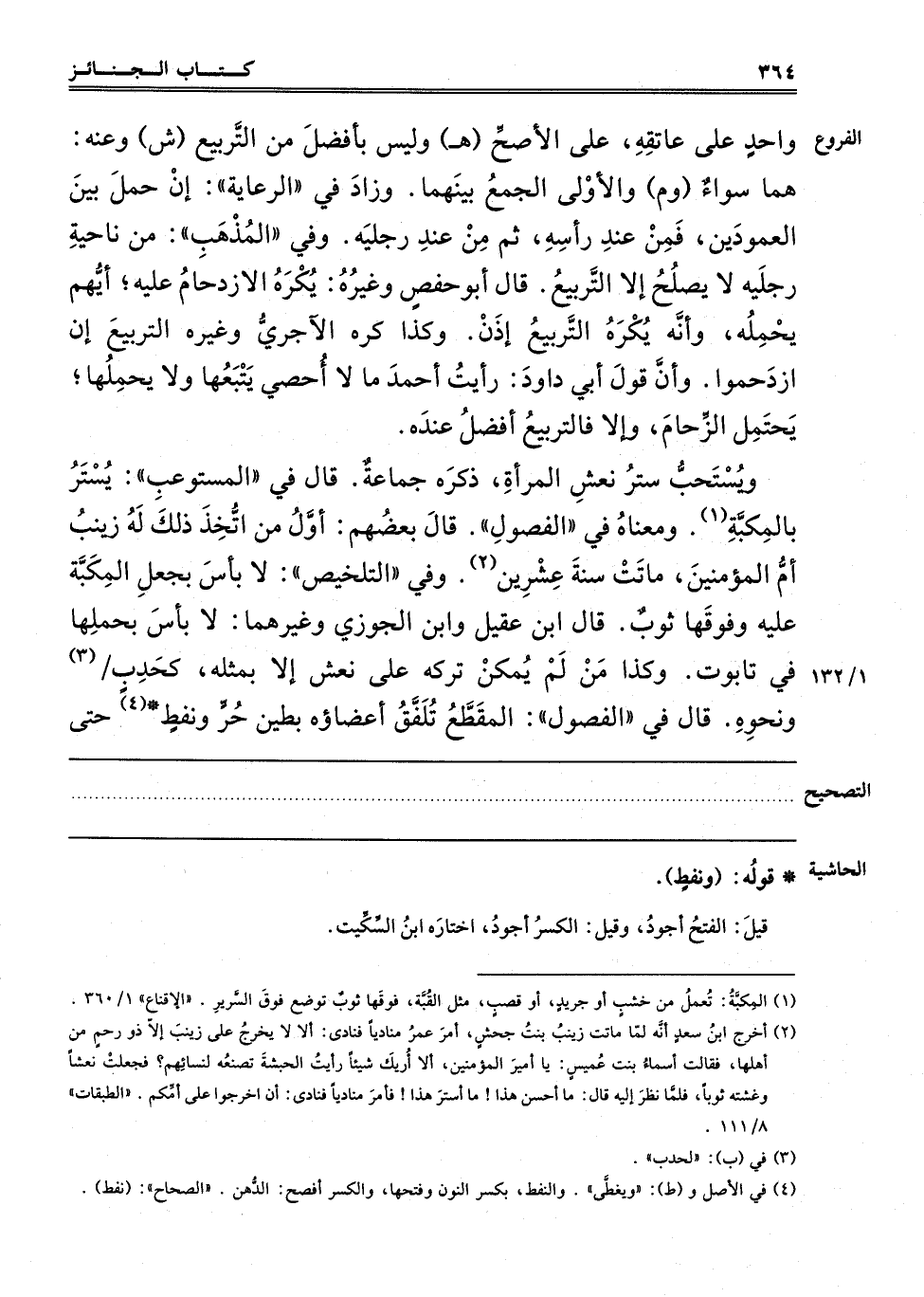 وَيُسْتَحَبُّ سَتْرُ نَعْشِ الْمَرْأَةِ، ذَكَرَهُ جَمَاعَةٌ، قَالَ فِي الْمُسْتَوْعِبِ: يُسْتَرُ بِالْمِكَبَّةِ1. وَمَعْنَاهُ فِي الْفُصُولِ، قَالَ بَعْضُهُمْ: أَوَّلُ مَنْ اُتُّخِذَ ذَلِكَ لَهُ زَيْنَبُ أُمُّ الْمُؤْمِنِينَ، مَاتَتْ سَنَةَ عِشْرِينَ2. وَفِي التَّلْخِيصِ: لَا بَأْسَ بِجَعْلِ الْمِكَبَّةِ عَلَيْهَا، وَفَوْقَهَا ثَوْبٌ، قَالَ ابْنُ عَقِيلٍ وَابْنُ الْجَوْزِيِّ وَغَيْرُهُمَا: لَا بَأْسَ بِحَمْلِهَا فِي تَابُوتٍ، وَكَذَا مَنْ لَا يُمْكِنُ تَرْكُهُ عَلَى نَعْشٍ إلَّا بِمِثْلِهِ، كَحَدَبٍ3 وَنَحْوِهِ. قَالَ فِي الْفُصُولِ: المقطع تلفق أعضاؤه بطين حر ونفط4 حتى