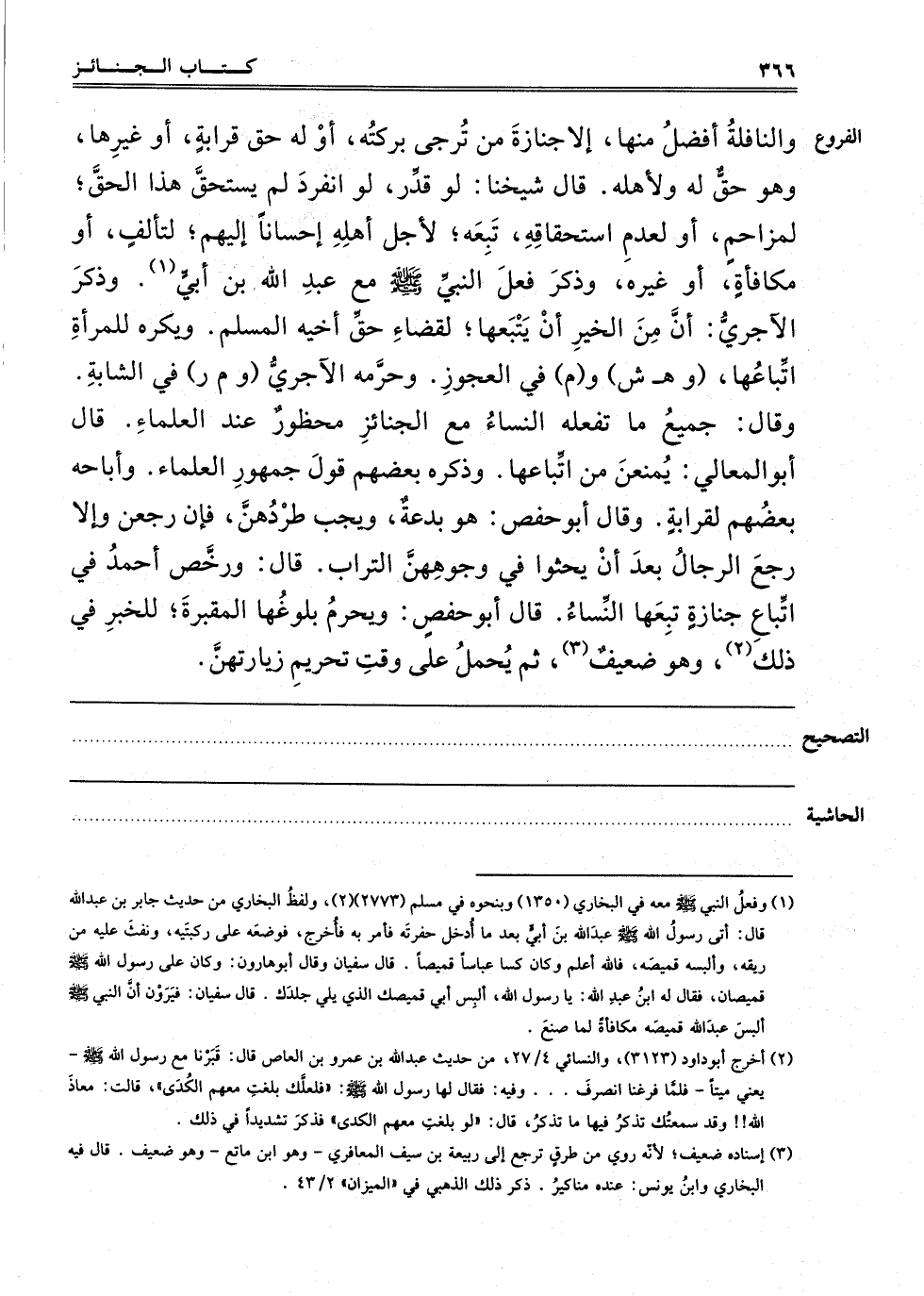 وَالنَّافِلَةُ أَفْضَلُ مِنْهَا، إلَّا جِنَازَةَ مَنْ تُرْجَى بَرَكَتُهُ، أَوْ لَهُ حَقُّ قَرَابَةٍ أَوْ غَيْرِهَا، وَهُوَ حَقٌّ لَهُ وَلِأَهْلِهِ، قَالَ شَيْخُنَا: لَوْ قَدَرَ لَوْ انْفَرَدَ لَمْ يَسْتَحِقَّ هَذَا الْحَقَّ لِمُزَاحِمٍ أَوْ لِعَدَمِ اسْتِحْقَاقِهِ تَبِعَهُ لِأَجْلِ أَهْلِهِ إحْسَانًا إلَيْهِمْ لِتَأَلُّفٍ أَوْ مُكَافَأَةٍ أَوْ غَيْرِهِ، وَذَكَرَ فِعْلَ النَّبِيِّ صَلَّى اللَّهُ عَلَيْهِ وَسَلَّمَ مَعَ عَبْدِ اللَّهِ بْنِ أُبَيٍّ1. وَذَكَرَ الْآجُرِّيُّ أَنَّ مِنْ الْخَيْرِ أَنْ يَتْبَعَهَا لِقَضَاءِ حَقِّ أَخِيهِ الْمُسْلِمِ، وَيُكْرَهُ لِلْمَرْأَةِ اتِّبَاعُهَا "وَهـ ش وم" فِي الْعَجُوزِ، وَحَرَّمَهُ الْآجُرِّيُّ "وم ر" فِي الشَّابَّةِ، وَقَالَ: جَمِيعُ مَا تَفْعَلُهُ النِّسَاءُ مَعَ الْجَنَائِزِ مَحْظُورٌ عِنْدَ الْعُلَمَاءِ، قَالَ أَبُو الْمَعَالِي: يُمْنَعْنَ مِنْ اتِّبَاعِهَا، وَذَكَرَهُ بَعْضُهُمْ: قَوْلُ جُمْهُورِ الْعُلَمَاءِ، وَأَبَاحَهُ بَعْضُهُمْ لِقَرَابَةٍ. وَقَالَ أَبُو حَفْصٍ: هُوَ بِدْعَةٌ، وَيَجِبُ طَرْدُهُنَّ، فَإِنْ رَجَعْنَ وَإِلَّا رَجَعَ الرِّجَالُ بَعْدَ أَنْ يَحْثُوَا فِي وُجُوهِهِنَّ التُّرَابَ، قَالَ: وَرَخَّصَ أَحْمَدُ فِي اتِّبَاعِ جِنَازَةٍ تَبِعَهَا النِّسَاءُ. قَالَ أَبُو حَفْصٍ: وَيَحْرُمُ بُلُوغُهَا الْمَقْبَرَةَ، لِلْخَبَرِ فِي ذَلِكَ2، وَهُوَ ضَعِيفٌ3، ثم يحمل على وقت تحريم زيارتهن.