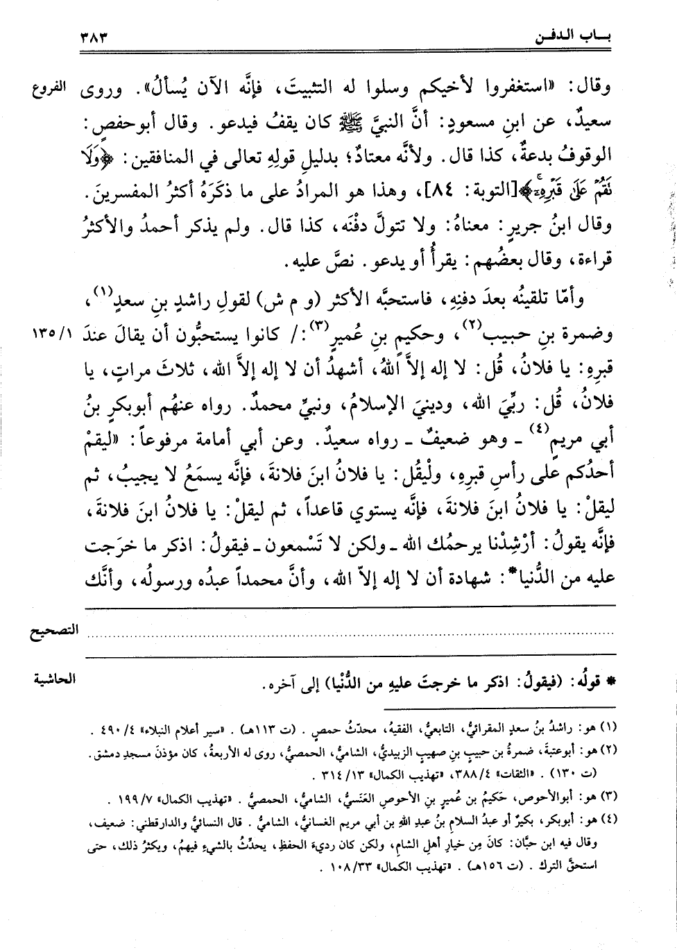 وَأَمَّا تَلْقِينُهُ بَعْدَ دَفْنِهِ فَاسْتَحَبَّهُ الْأَكْثَرُونَ "وَم ش" لِقَوْلِ رَاشِدِ بْنِ سَعْدٍ1، وَضَمْرَةَ بْنِ حَبِيبٍ2، وَحَكِيمِ بْنِ عُمَيْرٍ3: كَانُوا يَسْتَحِبُّونَ أَنْ يُقَالَ عِنْدَ قَبْرِهِ: يَا فُلَانُ، "لَا إلَهَ إلَّا اللَّهُ، اشْهَدْ أَنْ لَا إلَهَ إلَّا اللَّهُ" ثَلَاثَ مَرَّاتٍ "يَا فُلَانُ قُلْ رَبِّي اللَّهُ، وَدِينِي الْإِسْلَامُ، وَنَبِيِّ مُحَمَّدٌ" رَوَاهُ عَنْهُمْ أَبُو بَكْرِ بْنُ أَبِي مَرْيَمَ4 - وَهُوَ ضَعِيفٌ - رَوَاهُ سَعِيدٌ. وَعَنْ أَبِي أُمَامَةَ مَرْفُوعًا: "لِيَقُمْ أَحَدُكُمْ عَلَى رَأْسِ قَبْرِهِ وَلْيَقُلْ: يَا فُلَانَ ابْنَ فُلَانَةَ، فَإِنَّهُ يَسْمَعُ وَلَا يُجِيبُ، ثُمَّ لِيَقُلْ: يَا فُلَانَ ابْنَ فُلَانَةَ، فَإِنَّهُ يَسْتَوِي قَاعِدًا، ثُمَّ لِيَقُلْ: يَا فُلَانَ ابْنَ فُلَانَةَ، فَإِنَّهُ يَقُولُ: أَرْشِدْنَا يَرْحَمُك اللَّهُ وَلَكِنْ لَا تَسْمَعُونَ فَيَقُولُ: اُذْكُرْ مَا خَرَجْت عَلَيْهِ مِنْ الدُّنْيَا: شَهَادَةَ أَنْ لَا إلَهَ إلَّا اللَّهُ وَأَنَّ مُحَمَّدًا عبده ورسوله، وأنك