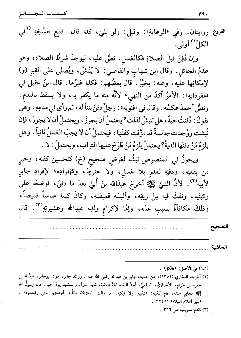 وَيَجُوزُ فِي الْمَنْصُوصِ نَبْشُهُ لِغَرَضٍ صَحِيحٍ "خ" كَتَحْسِينِ كَفَنِهِ، وَخَيْرٍ مِنْ بُقْعَتِهِ، وَدَفْنِهِ لِعُذْرٍ بِلَا غُسْلٍ وَلَا حَنُوطٍ، وَكَإِفْرَادِهِ، لِإِفْرَادِ جَابِرٍ لِأَبِيهِ2؛ لِأَنَّ النَّبِيَّ صَلَّى اللَّهُ عَلَيْهِ وَسَلَّمَ أَخْرَجَ عَبْدَ اللَّهِ بْنَ أُبَيٍّ بَعْدَمَا دُفِنَ، فَوَضَعَهُ عَلَى رُكْبَتَيْهِ، وَنَفَثَ فِيهِ مِنْ رِيقِهِ، وَأَلْبَسَهُ قَمِيصَهُ، وَكَانَ كَسَا عَبَّاسًا قَمِيصًا، وَذَلِكَ مُكَافَأَةٌ بِسَبَبِ عَمِّهِ، وَإِمَّا لِإِكْرَامِ وَلَدِهِ عَبْدِ اللَّهِ وعشيرته3. قال