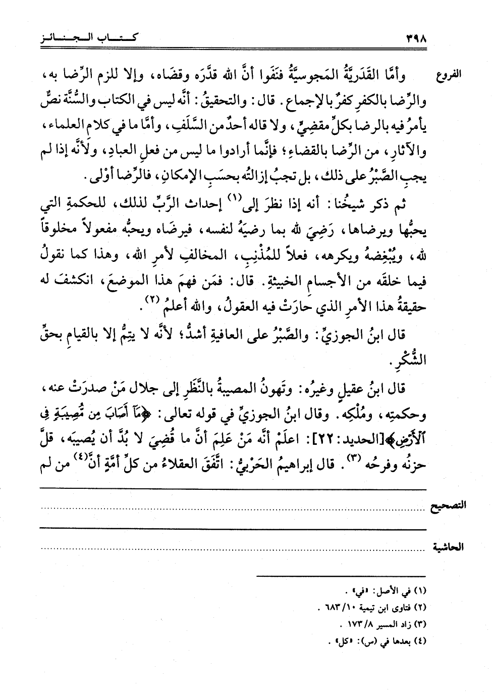 وَأَمَّا الْقَدَرِيَّةُ الْمَجُوسِيَّةُ فَنَفَوْا أَنَّ اللَّهَ قَدَّرَهُ وَقَضَاهُ وَإِلَّا لَلَزِمَ الرِّضَاءُ بِكُلِّ مُقْتَضًى "بِهِ، وَالرِّضَاءُ بِالْكُفْرِ كُفْرٌ بِالْإِجْمَاعِ، قَالَ: وَالتَّحْقِيقُ أَنَّهُ لَيْسَ فِي الْكِتَابِ وَالسُّنَّةِ نَصٌّ يَأْمُرُ فِيهِ بِالرِّضَاءِ" وَلَا قَالَهُ أَحَدٌ مِنْ السَّلَفِ، وَأَمَّا مَا فِي كَلَامِ الْعُلَمَاءِ وَالْآثَارِ مِنْ الرِّضَى بِالْقَضَاءِ فَإِنَّمَا أَرَادُوا مَا لَيْسَ مِنْ فِعْلِ الْعِبَادِ؛ وَلِأَنَّهُ إذَا لَمْ يَجِبْ الصَّبْرُ عَلَى ذَلِكَ، بَلْ تَجِبُ إزَالَتُهُ بِحَسَبِ الْإِمْكَانِ، فَالرِّضَاء أَوْلَى.