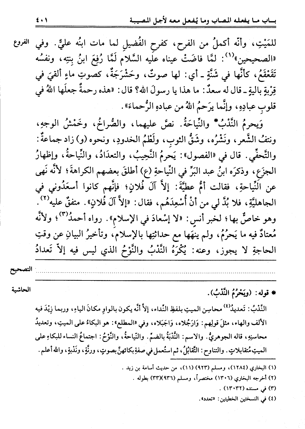 وَيَحْرُمُ النَّدْبُ وَالنِّيَاحَةُ، نَصَّ عَلَيْهِمَا، وَالصُّرَاخُ، وَخَمْشُ الْوَجْهِ، وَنَتْفُ الشَّعْرِ وَنَشْرُهُ، وَشَقُّ الثَّوْبِ، وَلَطْمُ الْخُدُودِ، وَنَحْوُهُ "و" زَادَ جَمَاعَةٌ: وَالتَّحَفِّي، قَالَ فِي الْفُصُولِ: يَحْرُمُ النَّحِيبُ وَالتَّعْدَادُ وَالنِّيَاحَةُ وَإِظْهَارُ الْجَزَعِ، وَذَكَرَهُ ابْنُ عَبْدِ الْبَرِّ فِي النِّيَاحَةِ "ع" وَأَطْلَقَ بَعْضُهُمْ الْكَرَاهَةَ؛ لِأَنَّهُ نَهَى عَنْ النِّيَاحَةِ، فَقَالَتْ أُمُّ عَطِيَّةَ: إلَّا الْ فُلَانٍ فَإِنَّهُمْ كَانُوا أَسْعَدُونِي فِي الْجَاهِلِيَّةِ، فَلَا بُدَّ لِي مِنْ أَنْ أُسْعِدَهُمْ، فَقَالَ: "إلَّا آلَ فُلَانٍ". مُتَّفَقٌ عَلَيْهِ2. وَهُوَ خَاصٌّ بِهَا، لِخَبَرِ أَنَسٍ: "لَا إسْعَادَ فِي الْإِسْلَامِ". رَوَاهُ أَحْمَدُ3؛ وَلِأَنَّهُ مُعْتَادٌ فِيهِ مَا يَحْرُمُ، وَلَمْ يَنْهَهَا مَعَ حَدَاثَتِهَا بِالْإِسْلَامِ، وَتَأْخِيرُ الْبَيَانِ عَنْ وَقْتِ الْحَاجَةِ لَا يَجُوزُ وَعَنْهُ: يُكْرَهُ النَّدْبُ وَالنَّوْحُ الَّذِي لَيْسَ فِيهِ إلا تعداد