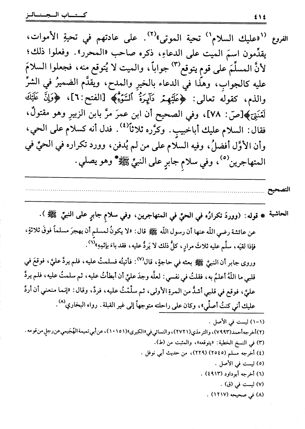 1 "عَلَيْك السَّلَامُ1 تَحِيَّةُ الْمَوْتَى" 2. عَلَى عَادَاتِهِمْ فِي تَحِيَّةِ الْأَمْوَاتِ يُقَدِّمُونَ اسْمَ الْمَيِّتِ عَلَى الدُّعَاءِ، ذَكَرَهُ صَاحِبُ الْمُحَرَّرِ، وَفَعَلُوا ذَلِكَ لِأَنَّ الْمُسَلِّمَ عَلَى قَوْمٍ يَتَوَقَّعُ3 جَوَابًا، وَالْمَيِّتُ لَا يُتَوَقَّعُ مِنْهُ، فَجَعَلُوا السَّلَامَ عَلَيْهِ كَالْجَوَابِ، وَهَذَا فِي الدُّعَاءِ بِالْخَيْرِ وَالْمَدْحِ، وَيُقَدَّمُ الضَّمِيرُ فِي الشَّرِّ والذم كقوله تعالى: {عَلَيْهِمْ دَائِرَةُ السَّوْءِ} [الفتح: 6] ، {وَإِنَّ عَلَيْكَ لَعْنَتِي} [ص: 78] ، وَفِي الصَّحِيحِ أَنَّ ابْنَ عُمَرَ مَرَّ بِابْنِ الزُّبَيْرِ وَهُوَ مَقْتُولٌ فَقَالَ: السَّلَامُ عَلَيْك أَبَا خُبَيْبٍ، وَكَرَّرَهُ ثَلَاثًا4. فَدَلَّ أَنَّهُ كَالسَّلَامِ عَلَى الْحَيِّ وَأَنَّ الْأَوَّلَ أَفْضَلُ، وَفِيهِ السَّلَامُ عَلَى مَنْ لَمْ يُدْفَنْ، وَوَرَدَ تَكْرَارُهُ فِي الْحَيِّ فِي الْمُتَهَاجِرِينَ5، وَفِي سَلَامِ ابْنِ جَابِرٍ عَلَى النَّبِيِّ صَلَّى اللَّهُ عليه وسلم وهو يصلي.