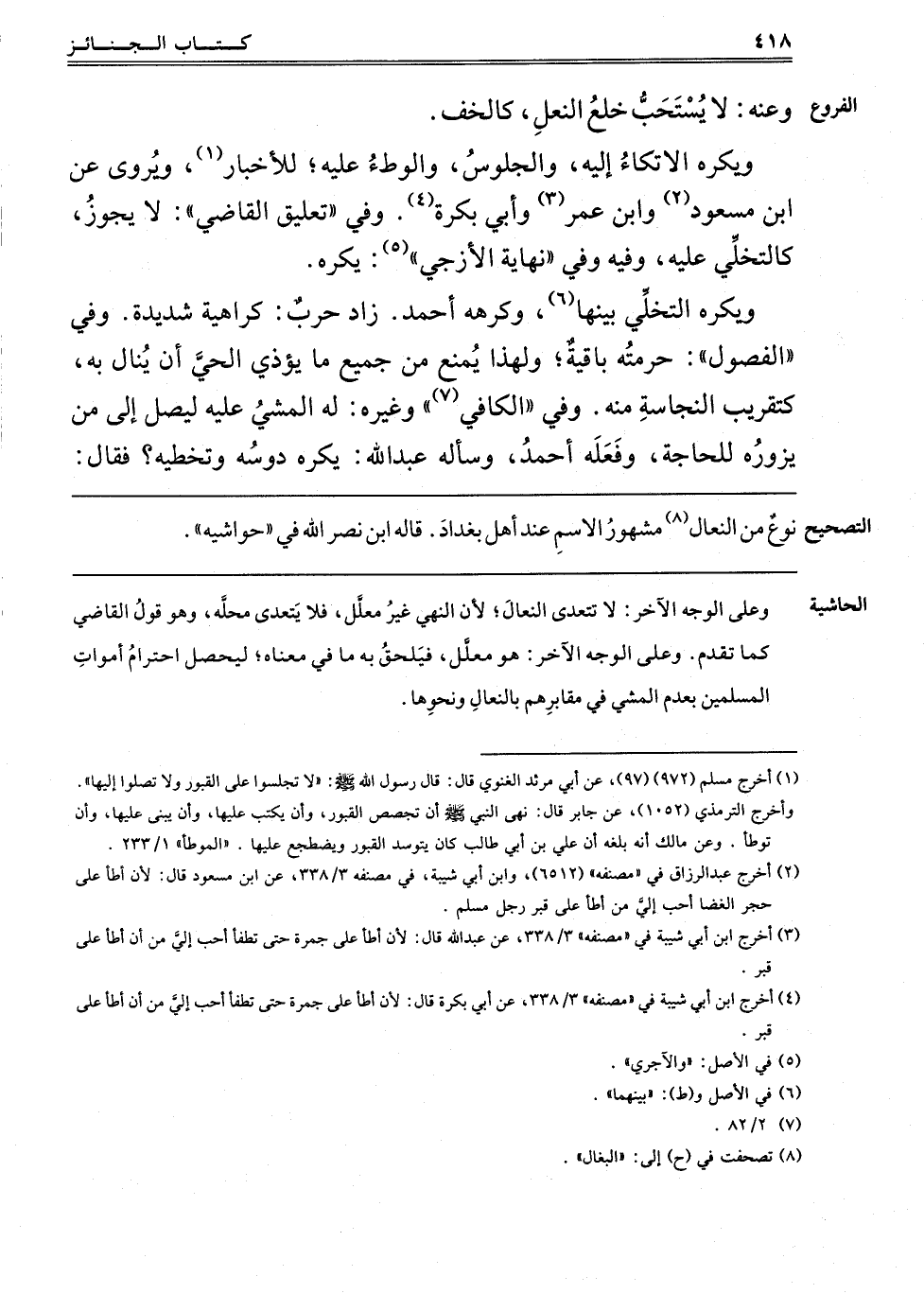 1 أخرج مسلم "972" "97"، عن أبي مرثد قَالَ: قَالَ رَسُولُ اللَّهِ صَلَّى اللَّهُ عَلَيْهِ وَسَلَّمَ: "لا تجلسوا على القبور ولا تصلوا إليها". وأخرج الترمذي "1052"، عن جابر قال: نهى النبي صلى الله عليه وسلم أن تجصص القبور، وأن يكتب عليها، وأن يبنى عليها، وأن توطأ. وعن مالك أنه بلغه أن علي بن أبي طالب كان يتوسد القبور، وأن يكتب عليها. "الموطأ" 1/233.