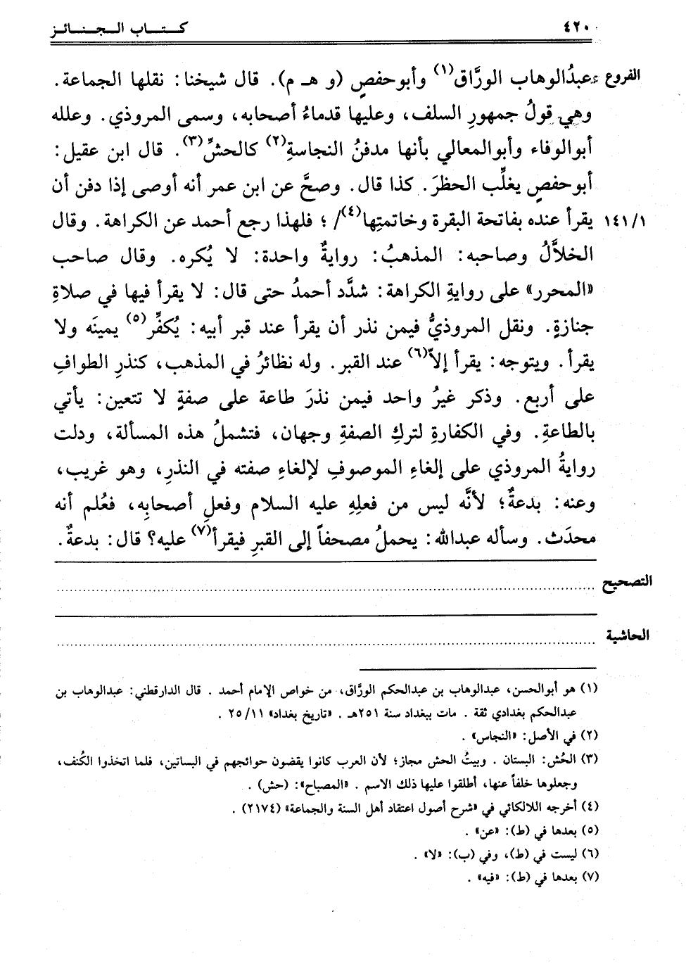 عَبْدُ الْوَهَّابِ الْوَرَّاقُ1 وَأَبُو حَفْصٍ "وهـ م" قَالَ شَيْخُنَا: نَقَلَهَا الْجَمَاعَةُ، وَهُوَ قَوْلُ جُمْهُورِ السَّلَفِ، وَعَلَيْهَا قُدَمَاءُ أَصْحَابِهِ، وَسَمَّى الْمَرُّوذِيُّ، وَعَلَّلَهُ أَبُو الْوَفَاءِ وَأَبُو الْمَعَالِي بِأَنَّهَا مَدْفِنُ النَّجَاسَةِ2، كَالْحَشِّ3. قَالَ ابْنُ عَقِيلٍ: أَبُو حَفْصٍ يُغَلَّبُ الْحَظْرُ، كَذَا قَالَ، وَصَحَّ عَنْ ابْنِ عُمَرَ أَنَّهُ أَوْصَى إذَا دُفِنَ أَنْ يُقْرَأَ عِنْدَهُ بفاتحة البقرة وخاتمتها4؛ فَلِهَذَا رَجَعَ أَحْمَدُ عَنْ الْكَرَاهَةِ. وَقَالَ الْخَلَّالُ وَصَاحِبُهُ: الْمَذْهَبُ رِوَايَةٌ وَاحِدَةٌ لَا يُكْرَهُ. وَقَالَ صَاحِبُ الْمُحَرَّرِ عَلَى رِوَايَةِ الْكَرَاهَةِ: شَدَّدَ أَحْمَدُ حَتَّى قَالَ: لَا يُقْرَأُ فِيهَا فِي صَلَاةِ جِنَازَةٍ، وَنَقَلَ الْمَرُّوذِيُّ فِيمَنْ نَذَرَ أَنْ يَقْرَأَ عِنْدَ قَبْرِ أَبِيهِ: يُكَفِّرُ5 عَنْ يَمِينِهِ وَلَا يقرأ، ويتوجه: يقرأ إلا6 عِنْدَ الْقَبْرِ، وَلَهُ نَظَائِرُ فِي الْمَذْهَبِ، كَنَذْرِ الطَّوَافِ عَلَى أَرْبَعٍ، وَذَكَرَ غَيْرُ وَاحِدٍ فِيمَنْ نَذَرَ طَاعَةً عَلَى صِفَةٍ لَا تَتَعَيَّنُ، يَأْتِي بِالطَّاعَةِ، وَفِي الْكَفَّارَةِ لِتَرْكِ الصِّفَةِ وَجْهَانِ، فَتَشْمَلُ هَذِهِ الْمَسْأَلَةَ، وَدَلَّتْ رِوَايَةُ الْمَرُّوذِيِّ عَلَى إلْغَاءِ الْمَوْصُوفِ لِإِلْغَاءِ صِفَتِهِ فِي النَّذْرِ، وَهُوَ غَرِيبٌ، وَعَنْهُ: بِدْعَةٌ؛ لِأَنَّهُ لَيْسَ مِنْ فِعْلِهِ عَلَيْهِ السَّلَامُ وَفِعْلِ أَصْحَابِهِ، فَعُلِمَ أَنَّهُ مُحْدَثٌ، وَسَأَلَهُ عَبْدُ اللَّهِ: يَحْمِلُ مُصْحَفًا إلَى الْقَبْرِ فَيَقْرَأُ7 فيه عليه؟ قال: بدعة.