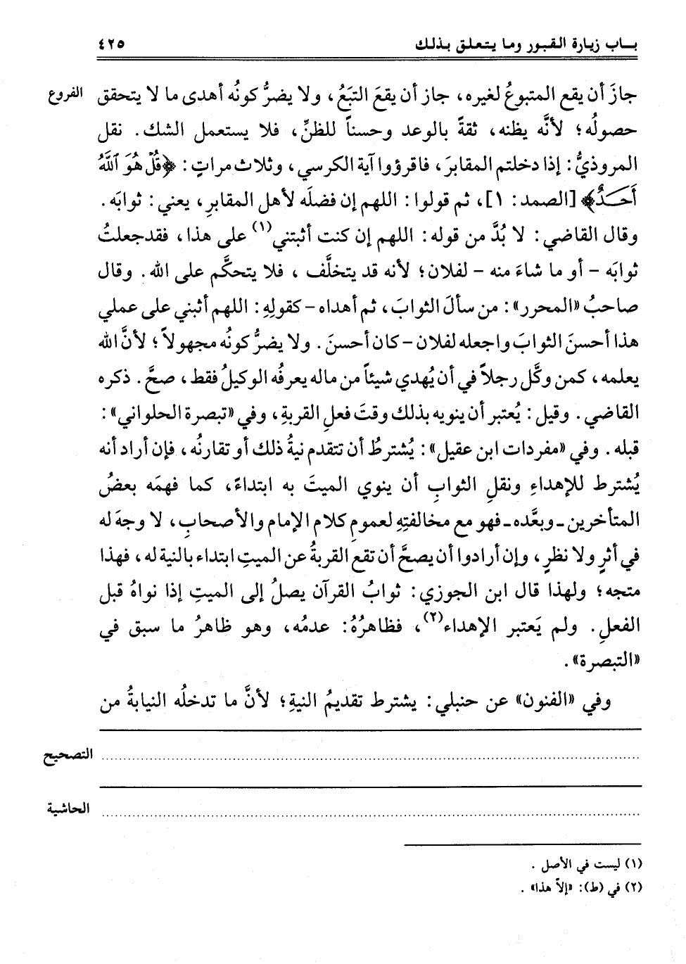 جَازَ أَنْ يَقَعَ الْمَتْبُوعُ لِغَيْرِهِ جَازَ أَنْ يَقَعَ التَّبَعُ، وَلَا يَضُرُّ كَوْنُهُ أَهْدَى مَا لَا يَتَحَقَّقُ حُصُولُهُ؛ لِأَنَّهُ يَظُنُّهُ، ثِقَةً بِالْوَعْدِ وَحُسْنًا لِلظَّنِّ، فَلَا يَسْتَعْمِلُ الشَّكَّ، نَقَلَ الْمَرُّوذِيُّ: إذَا دَخَلْتُمْ الْمَقَابِرَ فَاقْرَءُوا آيَةَ الْكُرْسِيِّ وَثَلَاثَ مرات: {قُلْ هُوَ اللَّهُ أَحَدٌ} [الصمد: 1] ، ثُمَّ قُولُوا: اللَّهُمَّ إنَّ فَضْلَهُ لِأَهْلِ الْمَقَابِرِ، يَعْنِي ثَوَابَهُ. وَقَالَ الْقَاضِي: لَا بُدَّ مِنْ قَوْلِهِ: اللَّهُمَّ إنْ كُنْت أَثَبْتنِي1 عَلَى هَذَا فَقَدْ جَعَلْت ثَوَابَهُ أَوْ مَا شَاءَ مِنْهُ لِفُلَانٍ؛ لِأَنَّهُ قَدْ يَتَخَلَّفُ، فَلَا يَتَحَكَّمُ عَلَى اللَّهِ. وَقَالَ صَاحِبُ الْمُحَرَّرِ: مَنْ سَأَلَ الثَّوَابَ ثُمَّ أَهْدَاهُ كَقَوْلِهِ: اللَّهُمَّ أَثِبْنِي عَلَى عَمَلِي هَذَا أَحْسَنَ الثَّوَابِ وَاجْعَلْهُ لِفُلَانٍ كَانَ أَحْسَنَ، وَلَا يَضُرُّ كَوْنُهُ مَجْهُولًا؛ لِأَنَّ اللَّهَ يَعْلَمُهُ، كَمَنْ وَكَّلَ رَجُلًا فِي أَنْ يُهْدِيَ شَيْئًا مِنْ مَالِهِ يَعْرِفُهُ الْوَكِيلُ فَقَطْ صَحَّ، ذَكَرَهُ الْقَاضِي، وَقِيلَ: يُعْتَبَرُ أَنْ يَنْوِيَهُ بِذَلِكَ وَقْتَ فِعْلِ الْقُرْبَةِ، وَفِي تَبْصِرَةِ الْحَلْوَانِيِّ: قَبْلَهُ. وَفِي مُفْرَدَاتِ ابْنِ عَقِيلٍ: يُشْتَرَطُ أَنْ تَتَقَدَّمَ نِيَّةُ ذَلِكَ أَوْ تُقَارِنُهُ، فَإِنْ أَرَادُوا أَنَّهُ يُشْتَرَطُ لِلْإِهْدَاءِ وَنَقْلِ الثَّوَابِ أَنْ يَنْوِيَ الْمَيِّتُ بِهِ ابْتِدَاءً كَمَا فَهِمَهُ بَعْضُ الْمُتَأَخِّرِينَ وَبَعَّدَهُ فَهُوَ مَعَ مُخَالَفَتِهِ لِعُمُومِ كَلَامِ الْإِمَامِ وَالْأَصْحَابِ لَا وَجْهَ لَهُ فِي أَثَرٍ وَلَا نَظَرٍ، وَإِنْ أَرَادُوا أَنَّهُ يَصِحُّ أَنْ تَقَعَ الْقُرْبَةُ عَنْ الْمَيِّتِ ابْتِدَاءً بِالنِّيَّةِ لَهُ فَهَذَا مُتَّجِهٌ، وَلِهَذَا قَالَ ابْنُ الْجَوْزِيِّ: ثَوَابُ الْقُرْآنِ يَصِلُ إلَى الْمَيِّتِ إذَا نَوَاهُ قَبْلَ الْفِعْلِ، وَلَمْ يُعْتَبَرْ الإهداء2، فَظَاهِرُهُ عَدَمُهَا، وَهُوَ ظَاهِرُ مَا سَبَقَ فِي التَّبْصِرَةِ.