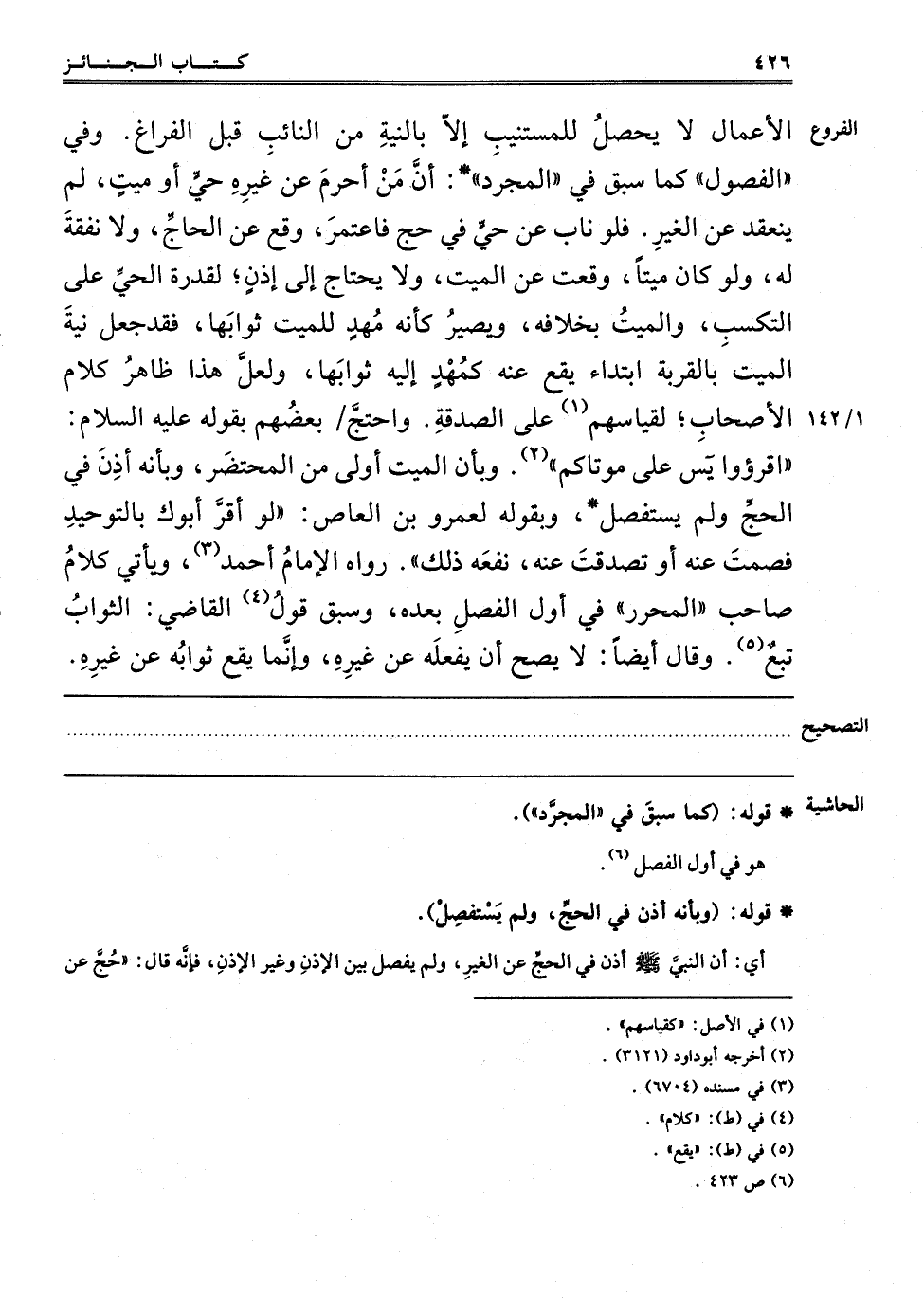 الْأَعْمَالِ لَا يَحْصُلُ لِلْمُسْتَنِيبِ إلَّا بِالنِّيَّةِ مِنْ النَّائِبِ قَبْلَ الْفَرَاغِ. وَفِي الْفُصُولِ كَمَا سَبَقَ فِي الْمُجَرَّدِ: أَنَّ مَنْ أَحْرَمَ عَنْ غَيْرِهِ حَيٍّ أَوْ مَيِّتٍ لَمْ يَنْعَقِدْ عَنْ الْغَيْرِ، فَلَوْ نَابَ عَنْ حَيٍّ فِي حَجٍّ فَاعْتَمَرَ وَقَعَ عَنْ الْحَاجِّ، وَلَا نَفَقَةَ لَهُ، وَلَوْ كَانَ مَيِّتًا وَقَعَ عَنْ الْمَيِّتِ وَلَا يَحْتَاجُ إلَى إذْنٍ، لِقُدْرَةِ الْحَيِّ عَلَى التَّكَسُّبِ، وَالْمَيِّتُ بِخِلَافِهِ، وَيَصِيرُ كَأَنَّهُ مُهْدٍ لِلْمَيِّتِ ثَوَابَهَا، فَقَدْ جَعَلَ نِيَّةَ الْمَيِّتِ بِالْقُرْبَةِ ابْتِدَاءً يَقَعُ عَنْهُ كَمُهْدٍ إلَيْهِ ثَوَابَهَا، وَلَعَلَّ هَذَا ظَاهِرُ كَلَامِ الْأَصْحَابِ؛ لِقِيَاسِهِمْ1 عَلَى الصَّدَقَةِ. وَاحْتَجَّ بَعْضُهُمْ بِقَوْلِهِ عَلَيْهِ السَّلَامُ: "اقْرَءُوا يَس عَلَى مَوْتَاكُمْ" 2. وَبِأَنَّ الْمَيِّتَ أَوْلَى مِنْ الْمُحْتَضَرِ، وَبِأَنَّهُ أَذِنَ فِي الْحَجِّ وَلَمْ يَسْتَفْصِلْ، وَبِقَوْلِهِ لِعَمْرِو بْنِ الْعَاصِ: "وَلَوْ أَقَرَّ أَبُوك بِالتَّوْحِيدِ فَصُمْت عَنْهُ أَوْ تَصَدَّقْت عَنْهُ نَفَعَهُ ذَلِكَ". رَوَاهُ الْإِمَامُ أَحْمَدُ3، وَيَأْتِي كَلَامُ صَاحِبِ الْمُحَرَّرِ فِي أَوَّلِ الْفَصْلِ بعده، وسبق قول4 القاضي: الثواب تبع5. وَقَالَ أَيْضًا: لَا يَصِحُّ أَنْ يَفْعَلَهُ عَنْ غيره، وإنما يقع ثوابه عن غيره.