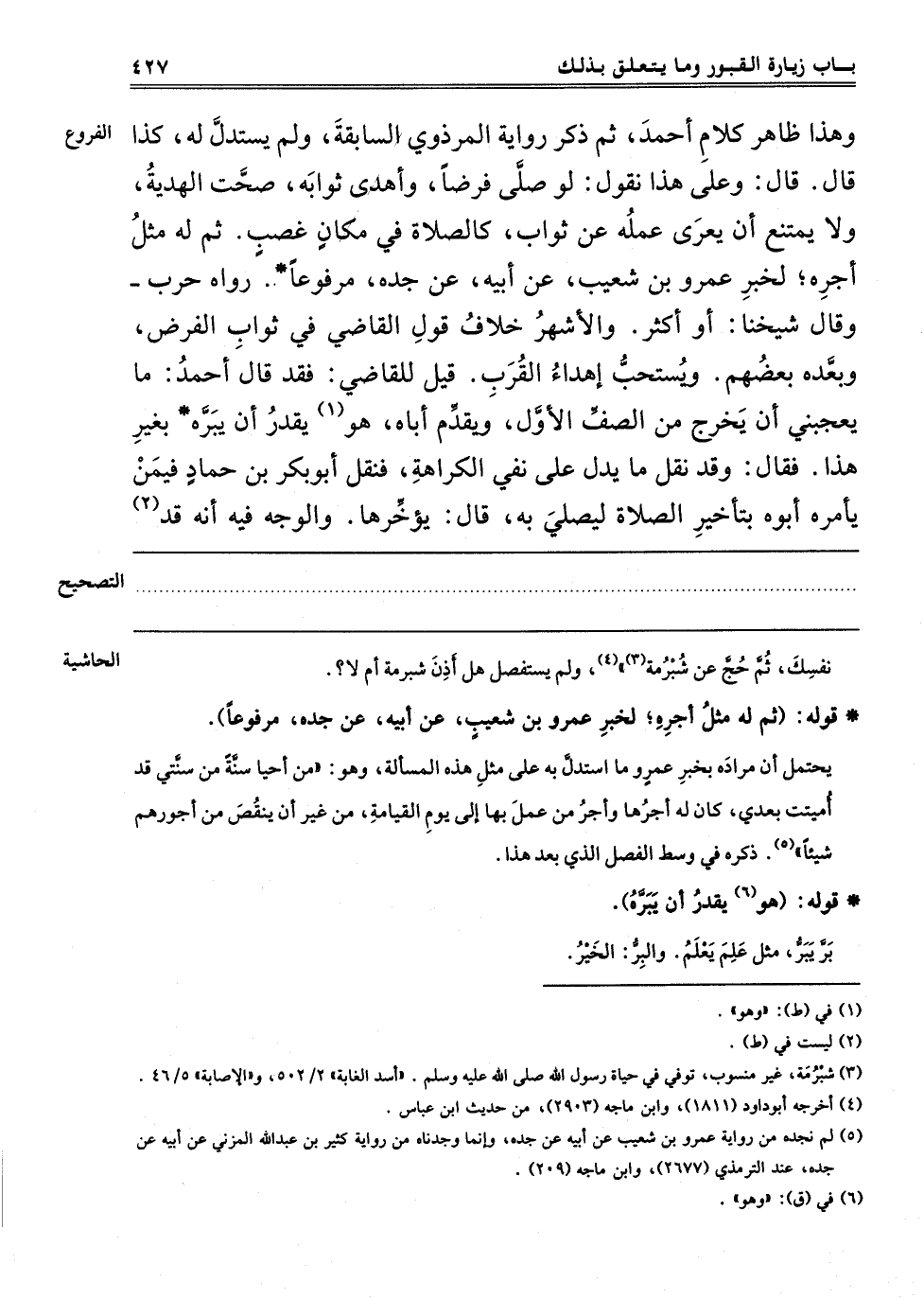 وَهَذَا ظَاهِرُ كَلَامِ أَحْمَدَ، ثُمَّ ذَكَرَ رِوَايَةَ الْمَرُّوذِيِّ السَّابِقَةَ وَلَمْ يَسْتَدِلَّ لَهُ، كَذَا قَالَ، قَالَ: وَعَلَى هَذَا يَقُولُ: لَوْ صَلَّى فَرْضًا وَأَهْدَى ثَوَابَهُ صَحَّتْ الْهَدِيَّةُ، وَلَا يَمْتَنِعُ أَنْ يُعَرَّى عَمَلُهُ عَنْ ثَوَابٍ، كَالصَّلَاةِ فِي مَكَان غَصْبٍ، ثُمَّ لَهُ مِثْلُ أَجْرِهِ لِخَبَرِ عَمْرِو بْنِ شُعَيْبٍ، عَنْ أَبِيهِ، عَنْ جَدِّهِ، مَرْفُوعًا، رَوَاهُ حَرْبٌ وَقَالَ شَيْخُنَا: أَوْ أَكْثَرَ، وَالْأَشْهَرُ خِلَافُ قَوْلِ الْقَاضِي فِي ثَوَابِ الْفَرْضِ، وَبَعَّدَهُ بَعْضُهُمْ، وَيُسْتَحَبُّ إهْدَاءُ الْقُرَبِ، قِيلَ لِلْقَاضِي: فَقَدْ قَالَ أَحْمَدُ: مَا يُعْجِبُنِي أَنْ يَخْرُجَ مِنْ الصف الأول ويقدم أباه، هو1 يَقْدِرُ أَنْ يَبَرَّهُ بِغَيْرِ هَذَا، فَقَالَ: وَقَدْ نُقِلَ مَا يَدُلُّ عَلَى نَفْيِ الْكَرَاهَةِ، فَنَقَلَ أَبُو بَكْرِ بْنُ حَمَّادٍ فِيمَنْ يَأْمُرُهُ أَبُوهُ بِتَأْخِيرِ، الصَّلَاةِ لِيُصَلِّيَ بِهِ، قَالَ: يُؤَخِّرُهَا، وَالْوَجْهُ فيه أنه قد2