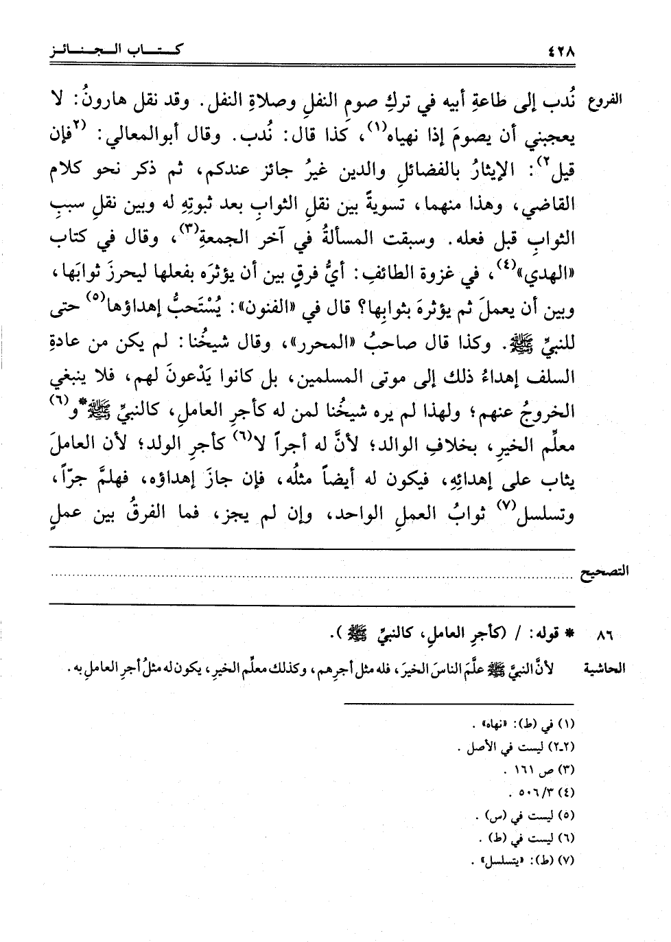نَدْبٌ إلَى طَاعَةِ أَبِيهِ فِي تَرْكِ صَوْمِ النَّفْلِ وَصَلَاةِ النَّفْلِ، وَقَدْ نَقَلَ هَارُونُ: لَا يُعْجِبُنِي أَنْ يَصُومَ إذَا نَهَاهُ1، كَذَا قَالَ: نَدْبٌ. وَقَالَ أَبُو الْمَعَالِي: 2"فَإِنْ قِيلَ"2: الْإِيثَارُ بِالْفَضَائِلِ وَالدِّينِ غَيْرُ جَائِزٍ عِنْدَكُمْ، ثُمَّ ذَكَرَ نَحْوَ كَلَامِ الْقَاضِي، وَهَذَا مِنْهُمَا تَسْوِيَةٌ بَيْنَ نَقْلِ الثَّوَابِ بَعْدَ ثُبُوتِهِ لَهُ وَبَيْنَ نَقْلِ سَبَبِ الثَّوَابِ قَبْلَ فِعْلِهِ، وَسَبَقَتْ الْمَسْأَلَةُ فِي آخِرِ الْجُمُعَةِ3، وَقَالَ فِي كِتَابِ الْهَدْيِ4، فِي غَزْوَةِ الطَّائِفِ: أَيْ فَرَّقَ بَيْنَ أَنْ يُؤْثِرَهُ بِفِعْلِهَا لِيُحْرِزَ ثَوَابَهَا، وَبَيْنَ أَنْ يَعْمَلَ ثُمَّ يُؤْثِرَهُ بِثَوَابِهَا؟ قَالَ فِي الْفُنُونِ: يُسْتَحَبُّ إهْدَاؤُهَا5 حَتَّى لِلنَّبِيِّ صَلَّى اللَّهُ عَلَيْهِ وَسَلَّمَ. وَكَذَا قَالَ صَاحِبُ الْمُحَرَّرِ. وَقَالَ شَيْخُنَا: لَمْ يَكُنْ مِنْ عَادَةِ السَّلَفِ إهْدَاءُ ذَلِكَ إلَى مَوْتَى الْمُسْلِمِينَ، بَلْ كَانُوا يَدْعُونَ لَهُمْ، فَلَا يَنْبَغِي الْخُرُوجُ عَنْهُمْ، وَلِهَذَا لَمْ يَرَهُ شَيْخُنَا لِمَنْ لَهُ كَأَجْرِ الْعَامِلِ، كَالنَّبِيِّ صَلَّى اللَّهُ عَلَيْهِ وسلم و6 مُعَلِّمِ الْخَيْرِ، بِخِلَافِ الْوَالِدِ لِأَنَّ لَهُ أَجْرًا لَا6 كَأَجْرِ الْوَلَدِ؛ وَلِأَنَّ الْعَامِلَ يُثَابُ عَلَى إهْدَائِهِ، فَيَكُونُ لَهُ أَيْضًا مِثْلُهُ، فَإِنْ جَازَ إهْدَاؤُهُ فَهَلُمَّ جَرًّا، وَيَتَسَلْسَلُ7 ثَوَابُ الْعَمَلِ الْوَاحِدِ، وَإِنْ لَمْ يَجُزْ فَمَا الْفَرْقُ بَيْنَ عَمَلٍ