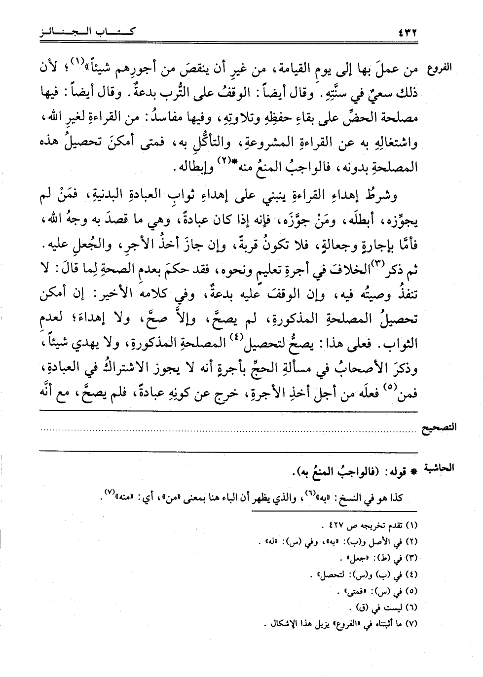 مَنْ عَمِلَ بِهَا إلَى يَوْمِ الْقِيَامَةِ، مِنْ غَيْرِ أَنْ يَنْقُصَ مِنْ أُجُورِهِمْ شَيْئًا" 1؛ لِأَنَّ ذَلِكَ سَعْيٌ فِي سُنَّتِهِ. وَقَالَ أَيْضًا: الْوَقْفُ عَلَى التُّرَبِ بِدْعَةٌ. وَقَالَ أَيْضًا: فِيهَا مَصْلَحَةُ الْحَضِّ عَلَى بَقَاءِ حِفْظِهِ وَتِلَاوَتِهِ، وَفِيهَا مَفَاسِدُ: مِنْ الْقِرَاءَةِ لِغَيْرِ اللَّهِ، وَاشْتِغَالِهِ بِهِ عَنْ الْقِرَاءَةِ الْمَشْرُوعَةِ، وَالتَّأَكُّلِ بِهِ، فَمَتَى أَمْكَنَ تَحْصِيلُ هَذِهِ الْمَصْلَحَةِ بِدُونِهِ فَالْوَاجِبُ الْمَنْعُ مِنْهُ2 وَإِبْطَالُهُ.