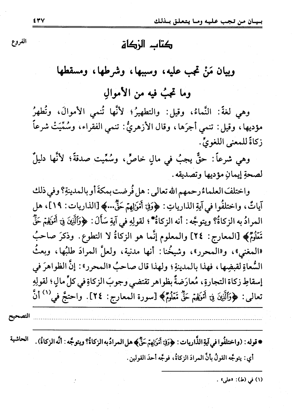 وَاخْتَلَفَ الْعُلَمَاءُ: هَلْ فُرِضَتْ بِمَكَّةَ أَوْ بِالْمَدِينَةِ؟ وَفِي ذَلِكَ آيَاتٌ، وَاخْتَلَفُوا فِي آيَةِ الذَّارِيَاتِ: {وَفِي أَمْوَالِهِمْ حَقٌّ} [الذاريات: 19] ، هَلْ الْمُرَادُ بِهِ الزَّكَاةُ؟ وَيَتَوَجَّهُ أَنَّهُ الزَّكَاةُ، لِقَوْلِهِ فِي آيَةِ سَأَلَ، {وَالَّذِينَ فِي أَمْوَالِهِمْ حَقٌّ مَعْلُومٌ} [المعارج: 24] وَالْمَعْلُومُ إنَّمَا هُوَ الزَّكَاةُ لَا التَّطَوُّعُ، وَذَكَرَ صَاحِبُ الْمُغْنِي وَالْمُحَرَّرِ وَشَيْخُنَا أَنَّهَا مَدَنِيَّةٌ، وَلَعَلَّ الْمُرَادَ طَلَبُهَا وَبَعْثُ السُّعَاةِ لِقَبْضِهَا، فَهَذَا بِالْمَدِينَةِ، وَلِهَذَا قَالَ صَاحِبُ الْمُحَرَّرِ: إنَّ الظَّوَاهِرَ فِي إسْقَاطِ زَكَاةِ التِّجَارَةِ مُعَارَضَةٌ بِظَوَاهِرَ تَقْتَضِي وُجُوبَ الزَّكَاةِ فِي كُلِّ مَالٍ، لِقَوْلِهِ تعالى {وَالَّذِينَ فِي أَمْوَالِهِمْ حَقٌّ مَعْلُومٌ} [سورة المعارج: 24] . واحتج في1 أن