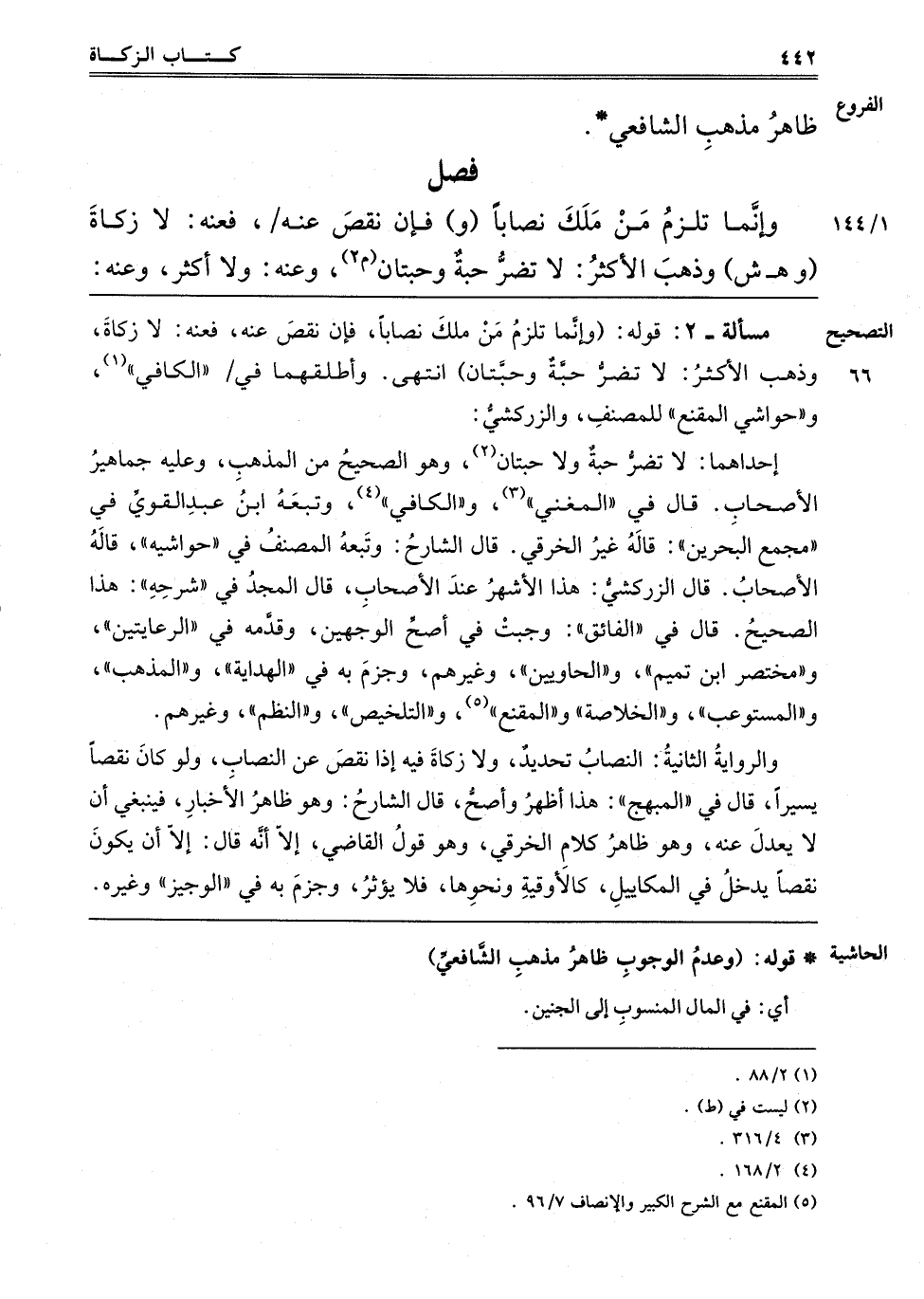 ـــــــــــــــــــــــــــــQمَسْأَلَةٌ - 2: قَوْلُهُ: وَإِنَّمَا تَلْزَمُ مَنْ مَلَكَ نِصَابًا، فإن نقص عنه فعنه: لا زكاة، وَذَكَرَ الْأَكْثَرُ: لَا تَضُرُّ حَبَّةٌ وَحَبَّتَانِ، انْتَهَى، وَأَطْلَقَهُمَا فِي الْكَافِي1، وَحَوَاشِي الْمُقْنِعِ لِلْمُصَنِّفِ وَالزَّرْكَشِيِّ: