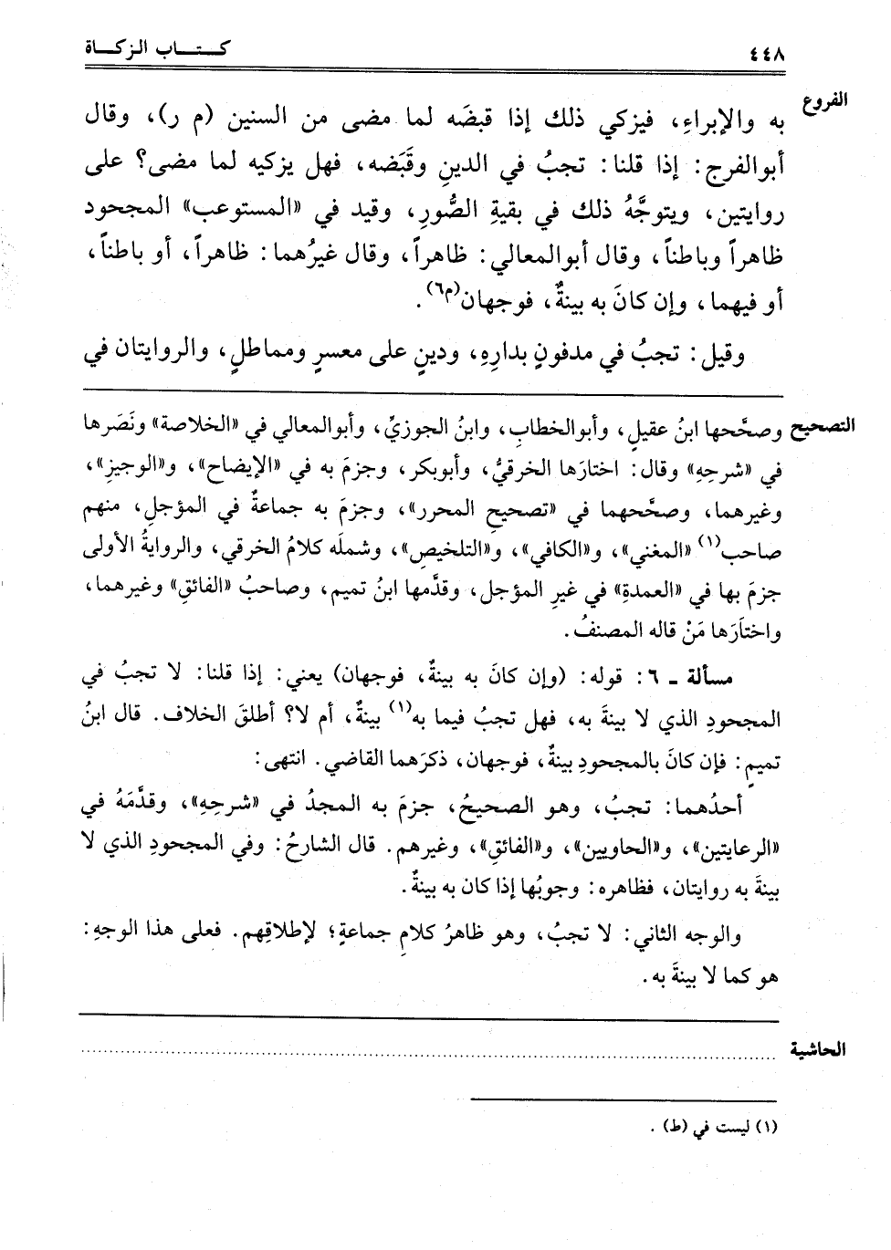 به والإبراء، فيزكي ذلك إذا قبضه لِمَا مَضَى مِنْ السِّنِينَ، خِلَافًا لِرِوَايَةٍ عَنْ مَالِكٍ. وَقَالَ أَبُو الْفَرَجِ: إذَا قُلْنَا تَجِبُ فِي الدَّيْنِ وَقَبْضِهِ، فَهَلْ يُزَكِّيهِ لِمَا مَضَى؟ عَلَى رِوَايَتَيْنِ، وَيَتَوَجَّهُ ذَلِكَ فِي بَقِيَّةِ الصُّوَرِ، وَقَيَّدَ فِي الْمُسْتَوْعِبِ الْمَجْحُودَ ظَاهِرًا وَبَاطِنًا. وَقَالَ أَبُو الْمَعَالِي: ظَاهِرًا، وَقَالَ غَيْرُهُمَا: ظَاهِرًا أَوْ بَاطِنًا أَوْ فِيهِمَا، وَإِنْ كَانَ بِهِ بَيِّنَةٌ فَوَجْهَانِ "م 6".