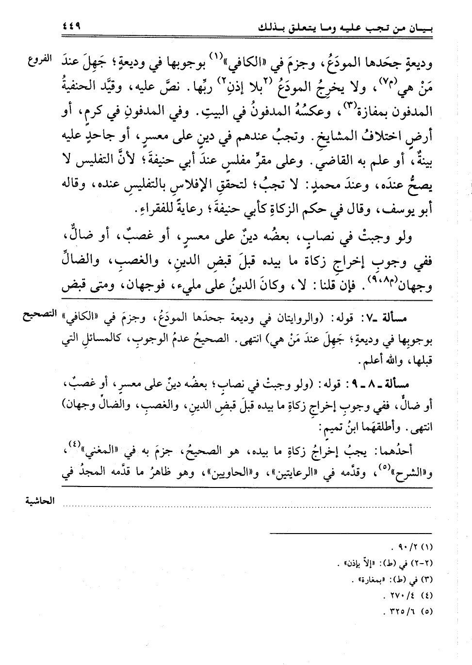 وَدِيعَةٍ جَحَدَهَا الْمُودَعُ، وَجَزَمَ فِي الْكَافِي1 بِوُجُوبِهَا فِي وَدِيعَةٍ جَهِلَ عِنْدَ مَنْ هِيَ "م 7" ولا يخرج المودع 2"بلا إذن"2 ربها. نص عليه وقيد الحنفية المدفون بمفازة3، وَعَكْسُهُ الْمَدْفُونُ فِي الْبَيْتِ، وَفِي الْمَدْفُونِ فِي كَرْمٍ أَوْ أَرْضٍ اخْتِلَافُ الْمَشَايِخِ، وَتَجِبُ عِنْدَهُمْ فِي دَيْنٍ عَلَى مُعْسِرٍ، أَوْ جَاحِدٍ عَلَيْهِ بَيِّنَةٌ، أَوْ عَلِمَ بِهِ الْقَاضِي، وَعَلَى مُقِرٍّ مُفْلِسٍ عِنْدَ أَبِي حَنِيفَةَ؛ لِأَنَّ التَّفْلِيسَ لَا يَصِحُّ عِنْدَهُ، وَعِنْدَ مُحَمَّدٍ، لَا تَجِبُ، لِتَحَقُّقِ الْإِفْلَاسِ بِالتَّفْلِيسِ عِنْدَهُ، وَقَالَهُ أَبُو يُوسُفَ، وَقَالَ فِي حُكْمِ الزَّكَاةِ كَقَوْلِ أَبِي حَنِيفَةَ: رِعَايَةً لِلْفُقَرَاءِ.