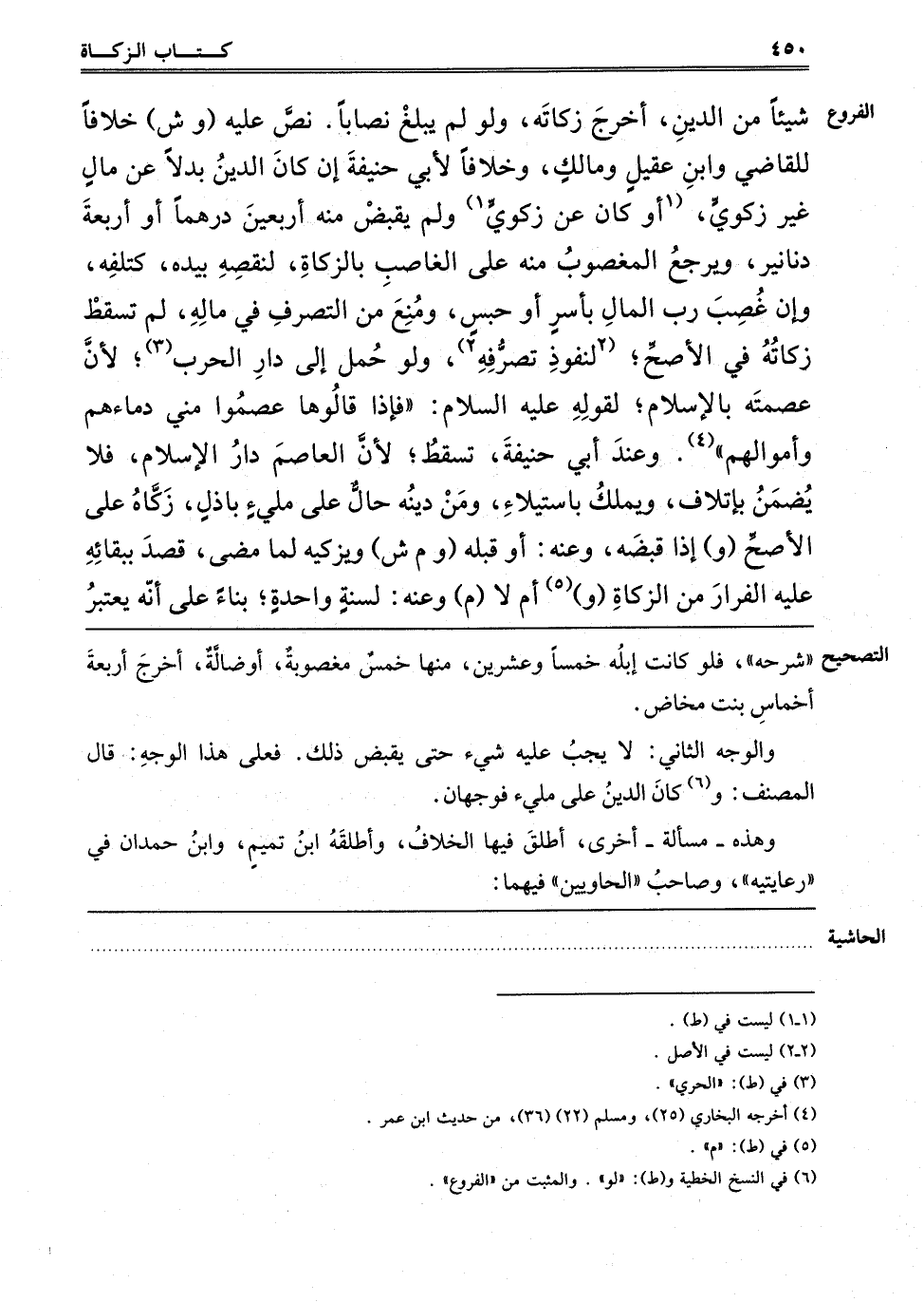 شَيْئًا مِنْ الدَّيْنِ، أَخْرَجَ زَكَاتَهُ، وَلَوْ لَمْ يبلغ نصابا، نص عليه "وش" خلافا للقاضي وابن عقيل ومالك، وخلافا لِأَبِي حَنِيفَةَ إنْ كَانَ الدَّيْنُ بَدَلًا عَنْ مال غير زكوي، 1"أو كان عن زَكَوِيٍّ"1 وَلَمْ يَقْبِضْ مِنْهُ أَرْبَعِينَ دِرْهَمًا أَوْ أَرْبَعَةَ دَنَانِيرَ، وَيَرْجِعُ الْمَغْصُوبُ مِنْهُ عَلَى الْغَاصِبِ بِالزَّكَاةِ، لِنَقْصِهِ بِيَدِهِ كَتَلَفِهِ، وَإِنْ غُصِبَ رَبُّ الْمَالِ بِأَسْرٍ أَوْ حَبْسٍ وَمُنِعَ مِنْ التَّصَرُّفِ فِي مَالِهٍ لَمْ تَسْقُطْ زَكَاتُهُ فِي الْأَصَحِّ، 2"لِنُفُوذِ تَصَرُّفِهِ"2، وَلَوْ حُمِلَ إلَى دَارِ الْحَرْبِ3؛ لِأَنَّ عِصْمَتَهُ بِالْإِسْلَامِ، لِقَوْلِهِ عَلَيْهِ السَّلَامُ: "فَإِذَا قَالُوهَا عَصَمُوا مِنِّي دِمَاءَهُمْ وَأَمْوَالَهُمْ" 4. وَعِنْدَ أَبِي حَنِيفَةَ تَسْقُطُ؛ لِأَنَّ الْعَاصِمَ دَارُ الْإِسْلَامِ فَلَا يَضْمَنُ بِإِتْلَافٍ، وَيَمْلِكُ بِاسْتِيلَاءٍ، وَمَنْ دَيْنُهُ حَالٌّ عَلَى مَلِيءٍ بَاذِلٍ زَكَّاهُ عَلَى الْأَصَحِّ، وِفَاقًا، إذا قبضه، وعنه: أو قبله "وم ش" وَيُزَكِّيهِ لِمَا مَضَى، قَصَدَ بِبَقَائِهِ عَلَيْهِ الْفِرَارَ مِنْ الزَّكَاةِ "و"5 أَمْ لَا "م" وَعَنْهُ: لِسَنَةٍ وَاحِدَةٍ، بِنَاءً عَلَى أَنَّهُ يُعْتَبَرُ
