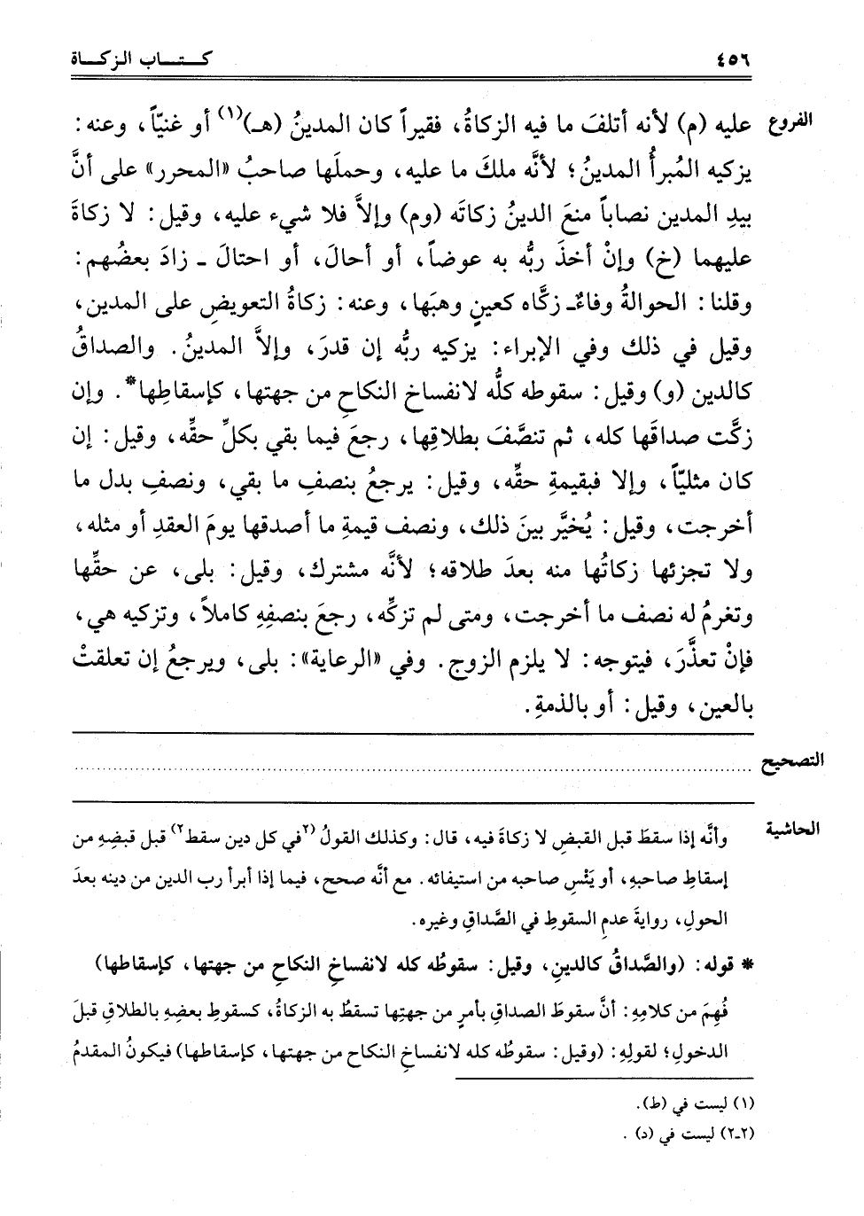 عَلَيْهِ "م" لِأَنَّهُ أَتْلَفَ مَا فِيهِ الزَّكَاةُ، فقيرا كان المدين "هـ"1 أَوْ غَنِيًّا، وَعَنْهُ: يُزَكِّيهِ الْمَدِينُ الْمُبَرَّأُ، لِأَنَّهُ "مَلَكَ" مَا عَلَيْهِ، وَحَمَلَهَا صَاحِبُ الْمُحَرَّرِ عَلَى أَنَّ بِيَدِ الْمَدِينِ نِصَابًا مَنَعَ الدَّيْنُ زَكَاتَهُ "وم" وَإِلَّا فَلَا شَيْءَ عَلَيْهِ، وَقِيلَ: لَا زَكَاةَ عَلَيْهِمَا "خ" وَإِنْ أَخَذَ رَبُّهُ "بِهِ" عِوَضًا أَوْ أَحَالَ أَوْ احْتَالَ زَادَ بَعْضُهُمْ: وَقُلْنَا الْحَوَالَةُ وَفَاءٌ زَكَّاهُ كَعَيْنٍ وَهَبَهَا، وَعَنْهُ: زَكَاةُ التَّعْوِيضِ عَلَى الْمَدِينِ، وَقِيلَ فِي ذَلِكَ وَفِي الْإِبْرَاءِ: يُزَكِّيهِ رَبُّهُ إنْ قَدَرَ وَإِلَّا الْمَدِينُ، وَالصَّدَاقُ كَالدَّيْنِ "و" وَقِيلَ: سُقُوطُهُ كُلُّهُ، لِانْفِسَاخِ النِّكَاحِ مِنْ جِهَتِهَا، كَإِسْقَاطِهَا وَإِنْ زَكَّتْ صَدَاقَهَا كُلَّهُ ثُمَّ تَنَصَّفَ بِطَلَاقِهَا رَجَعَ فِيمَا بَقِيَ بِكُلِّ حَقِّهِ، وَقِيلَ: إنْ كَانَ مَلِيئًا وَإِلَّا فَبِقِيمَةِ حَقِّهِ، وَقِيلَ: يَرْجِعُ بِنِصْفِ مَا بقي وَنِصْفِ بَدَلِ مَا أَخْرَجَتْ، وَقِيلَ: يُخَيَّرُ بَيْنَ ذَلِكَ وَنِصْفِ قِيمَةِ مَا أَصْدَقَهَا يَوْمَ الْعَقْدِ أَوْ مِثْلَهُ، وَلَا تُجْزِئُهَا زَكَاتُهَا مِنْهُ بَعْدَ طَلَاقِهِ؛ لِأَنَّهُ مُشْتَرَكٌ، وَقِيلَ: بَلَى، عَنْ حَقِّهَا وَتَغْرَمُ لَهُ نِصْفَ مَا أَخْرَجَتْ، وَمَتَى لَمْ تُزَكِّهِ رَجَعَ بِنِصْفِهِ كَامِلًا، وَتُزَكِّيهِ هِيَ، فَإِنْ تَعَذَّرَ فَيَتَوَجَّهُ: لَا يَلْزَمُ الزَّوْجَ، وَفِيهَا فِي الرِّعَايَةِ بَلَى، وَيَرْجِعُ عَلَيْهَا إنْ تَعَلَّقَتْ بِالْعَيْنِ، وقيل: أو بالذمة.