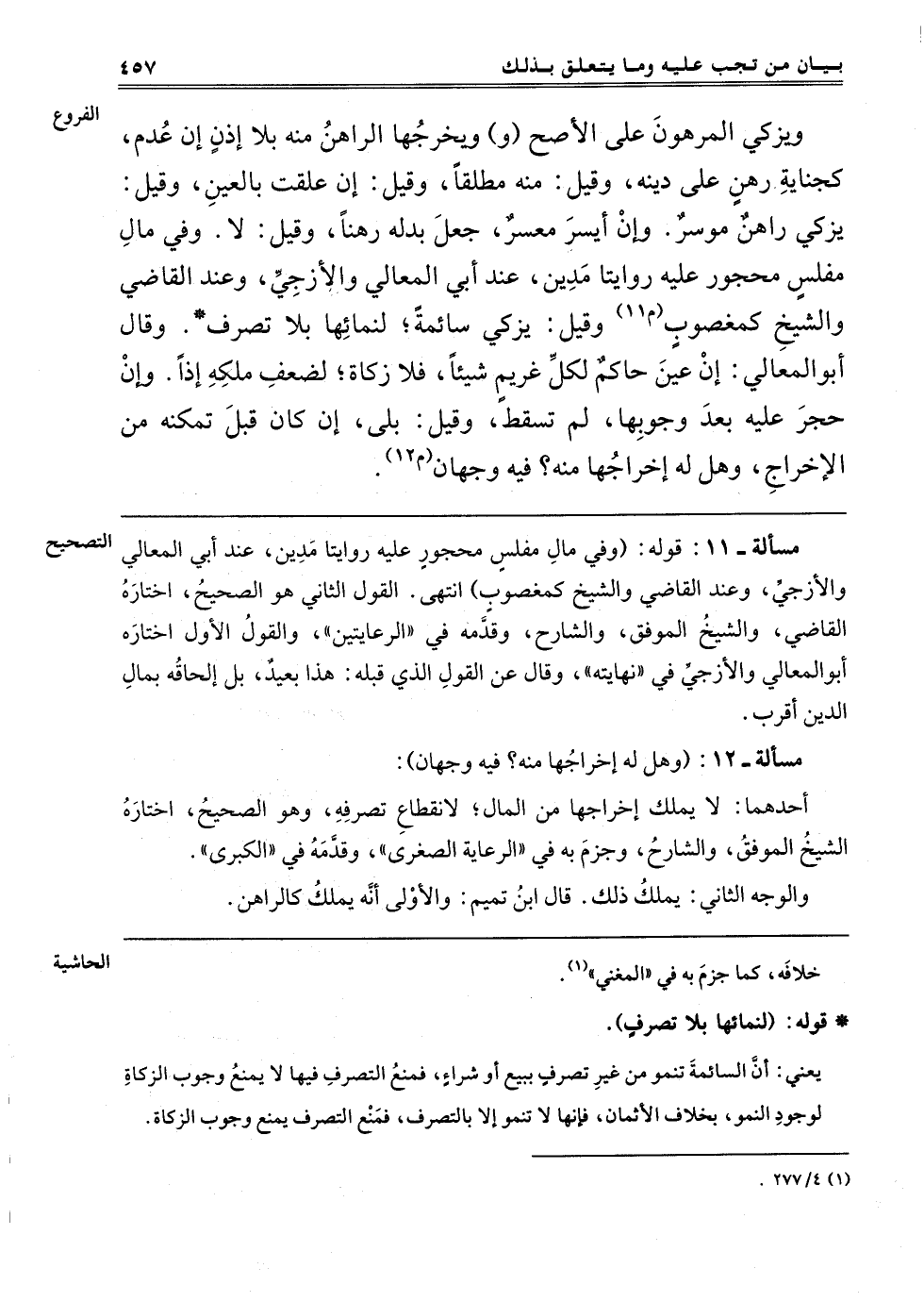 وَيُزَكَّى الْمَرْهُونُ عَلَى الْأَصَحِّ "و" وَيُخْرِجُهَا الرَّاهِنُ مِنْهُ بِلَا إذْنٍ إنْ عَدِمَ، كَجِنَايَةِ رَهْنٍ عَلَى دَيْنِهِ، وَقِيلَ: مِنْهُ مُطْلَقًا، وَقِيلَ: إنْ تَعَلَّقَتْ بِالْعَيْنِ، وَقِيلَ: يُزَكِّي رَاهِنٌ مُوسِرٌ، وَإِنْ أَيْسَرَ مُعْسِرٌ جَعَلَ بَدَلَهُ رَهْنًا، وَقِيلَ: لَا. وَفِي مَالِ مُفْلِسٍ مَحْجُورٍ عَلَيْهِ رِوَايَتَا مُدَّيْنِ، عِنْدَ أَبِي الْمَعَالِي وَالْأَزَجِيِّ، وَعِنْدَ الْقَاضِي وَالشَّيْخِ كَمَغْصُوبٍ "م 11" وَقِيلَ: يُزَكِّي سَائِمَةً، لِنَمَائِهَا بِلَا تَصَرُّفٍ، قَالَ أَبُو الْمَعَالِي: إنْ عَيَّنَ حَاكِمٌ لِكُلِّ غَرِيمٍ شَيْئًا فَلَا زَكَاةَ، لِضَعْفِ مِلْكِهِ إذًا، وَإِنْ حَجَرَ عَلَيْهِ بَعْدَ وُجُوبِهَا لَمْ تَسْقُطْ، وَقِيلَ: بَلَى إنْ كَانَ قَبْلَ تَمَكُّنِهِ مِنْ الْإِخْرَاجِ، وَهَلْ لَهُ إخْرَاجُهَا مِنْهُ؟ فِيهِ وجهان "م 12".