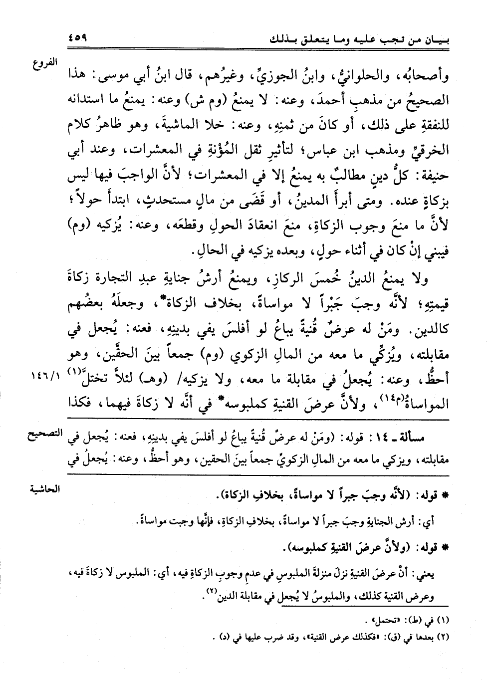 وَأَصْحَابُهُ، وَالْحَلْوَانِيُّ وَابْنُ الْجَوْزِيِّ وَغَيْرُهُمْ، قَالَ ابْنُ أَبِي مُوسَى: هَذَا الصَّحِيحُ مِنْ مَذْهَبِ أَحْمَدَ، وعنه: لا يمنع "وم ش" وَعَنْهُ: يَمْنَعُ مَا اسْتَدَانَهُ لِلنَّفَقَةِ عَلَى ذَلِكَ أَوْ كَانَ مِنْ ثَمَنِهِ، وَعَنْهُ: خَلَا الماشية، وهو ظَاهِرُ كَلَامِ الْخِرَقِيِّ وَمَذْهَبِ ابْنِ عَبَّاسٍ، لِتَأْثِيرِ ثِقَلِ الْمُؤْنَةِ فِي الْمُعَشَّرَاتِ، وَعِنْدَ "هـ" كُلِّ دَيْنٍ مُطَالَبٍ بِهِ يُمْنَعُ إلَّا فِي الْمُعَشَّرَاتِ؛ لِأَنَّ الْوَاجِبَ فِيهَا لَيْسَ بِزَكَاةٍ عِنْدَهُ، وَمَتَى أَبْرَأَ الْمَدِينُ أَوْ قَضَى مِنْ مَالٍ مُسْتَحْدَثٍ ابْتَدَأَ حَوْلًا؛ لِأَنَّ مَا مَنَعَ وُجُوبَ الزَّكَاةِ منع انعقاد الحول، وقطعه، وعنه: يزكيه "وم" فَيَبْنِي إنْ كَانَ فِي أَثْنَاءِ الْحَوْلِ، وَبَعْدَهُ يُزَكِّيهِ فِي الْحَالِ.