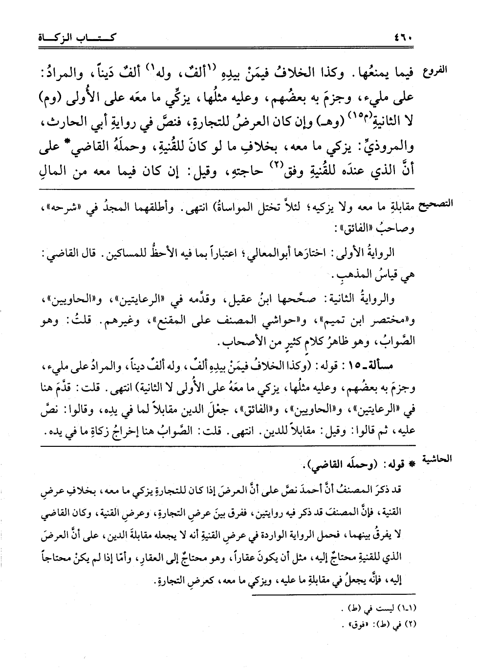 مَسْأَلَةٌ - 15: قَوْلُهُ: وَكَذَا الْخِلَافُ فِيمَنْ بِيَدِهِ أَلْفٌ، وَلَهُ أَلْفٌ دَيْنًا وَالْمُرَادُ عَلَى مَلِيءٍ، وَجَزَمَ بِهِ بَعْضُهُمْ وَعَلَيْهِ مِثْلُهَا، يُزَكِّي مَا مَعَهُ عَلَى الْأُولَى لَا الثَّانِيَةِ، انْتَهَى. "قُلْت": قَدَّمَ هُنَا فِي الرِّعَايَتَيْنِ وَالْحَاوِيَيْنِ وَالْفَائِقِ جَعْلَ الدَّيْنِ مُقَابِلًا لِمَا فِي يَدِهِ، وَقَالُوا: نَصَّ عَلَيْهِ، ثُمَّ قَالُوا: وَقِيلَ مُقَابِلًا لِلدَّيْنِ، انْتَهَى. "قُلْت": الصَّوَابُ هُنَا إخْرَاجُ زَكَاةِ مَا فِي يَدِهِ.