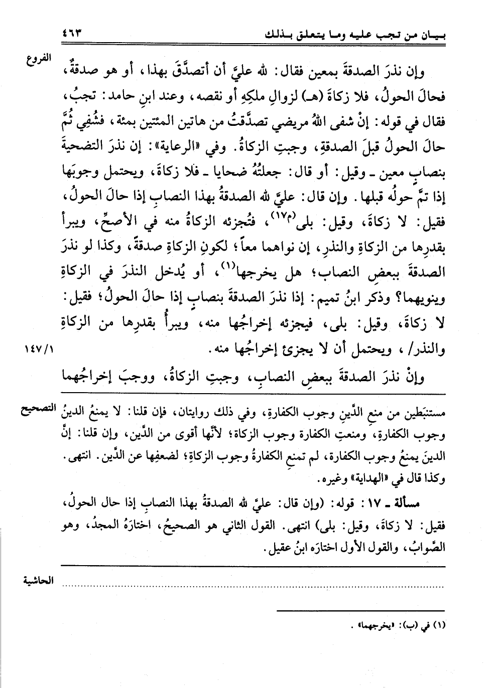 مَسْأَلَةٌ - 17: قَوْلُهُ: وَإِنْ قَالَ: لِلَّهِ عَلَيَّ الصَّدَقَةُ بِهَذَا النِّصَابِ إذَا حَالَ الْحَوْلُ، فَقِيلَ لَا زَكَاةَ، وَقِيلَ: بَلَى، انْتَهَى، الْقَوْلُ الثَّانِي هُوَ الصَّحِيحُ، اخْتَارَهُ الْمَجْدُ، وَهُوَ الصَّوَابُ، وَالْقَوْلُ الْأَوَّلُ اختاره ابن عقيل.